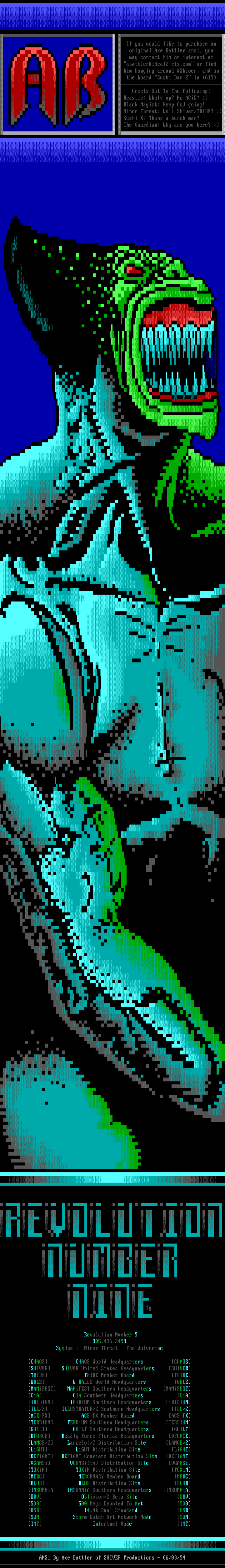 If you would like to purchase an original Axe Battler ansi, you may contact him on internet at abattler@ideal2.cts.com or find him hanging around Shiver, and on the board Sushi Bar Z in 619 Greets Out To The Following: Beastie: Whats up? No ACiD! Black Magick: Keep CoJ going! Minor Threat: Well Shiver/TRiBE? : Sushi-X: Thanx a bunch man! The Guardian: Why are you here?
