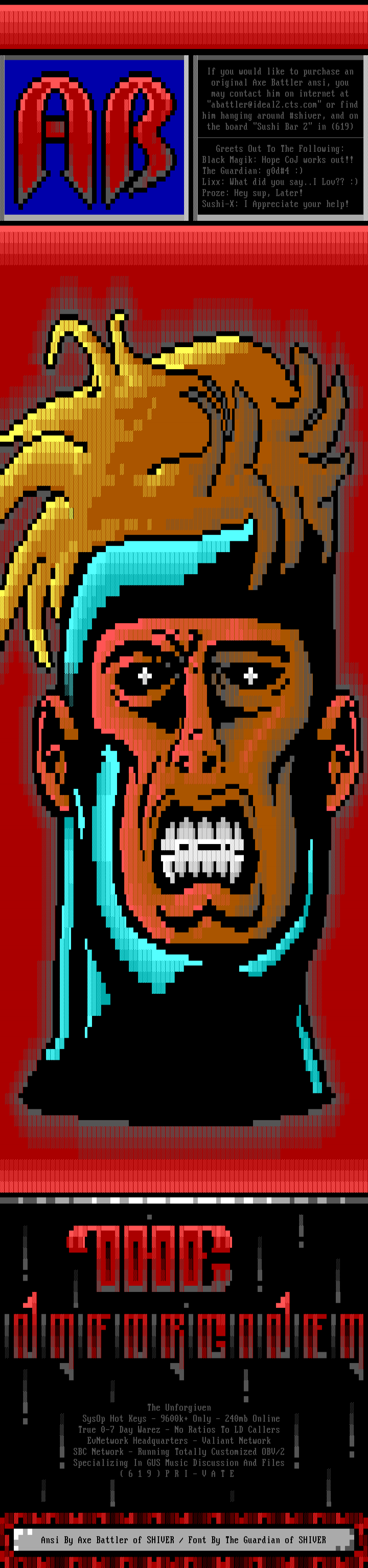 If you would like to purchase an original Axe Battler ansi, you may contact him on internet at abattler@ideal2.cts.com or find him hanging around shiver, and on the board Sushi Bar Z in 619 Greets Out To The Following: Black Magik: Hope CoJ works out!! The Guardian: g0d4 : Lixx: What did you say..I Lov?? : Proze: Hey sup, Later! Sushi-X: I Appreciate your help!