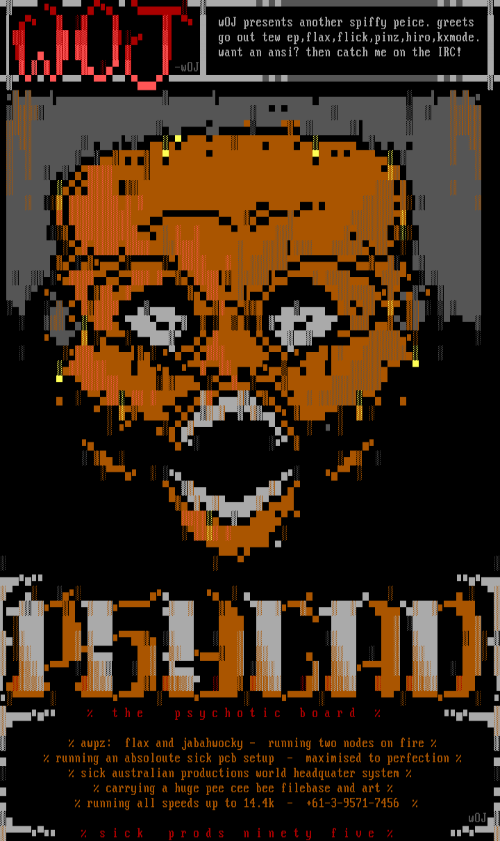 awpz: flax and jabahwocky - running two nodes on fire running an absoloute sick pcb setup - maximised to perfection sick australian productions world headquater system carrying a huge pee cee bee filebase and art running all speeds up to 14.4k - +61-3-9571-7456 wOJ s i c k p r o d s n i n e t y f i v e