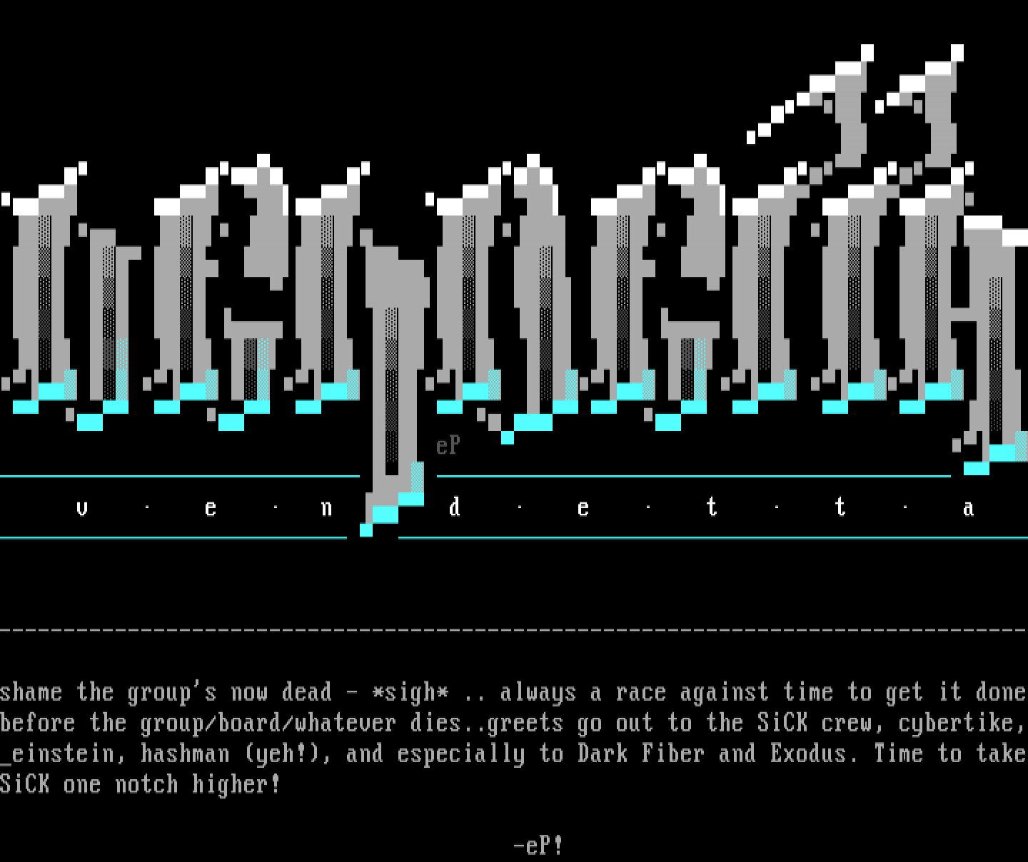 shame the groups now dead - *sigh* .. always a race against time to get it donebefore the group/board/whatever dies..greets go out to the SiCK crew, cybertike,einstein, hashman yeh!, and especially to Dark Fiber and Exodus. Time to takeSiCK one notch higher!