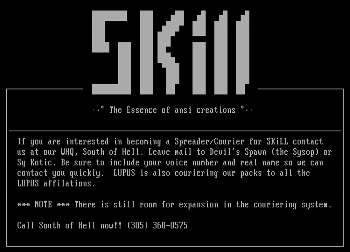 us at our WHQ, South of Hell. Leave mail to Devils Spawn the Sysop or