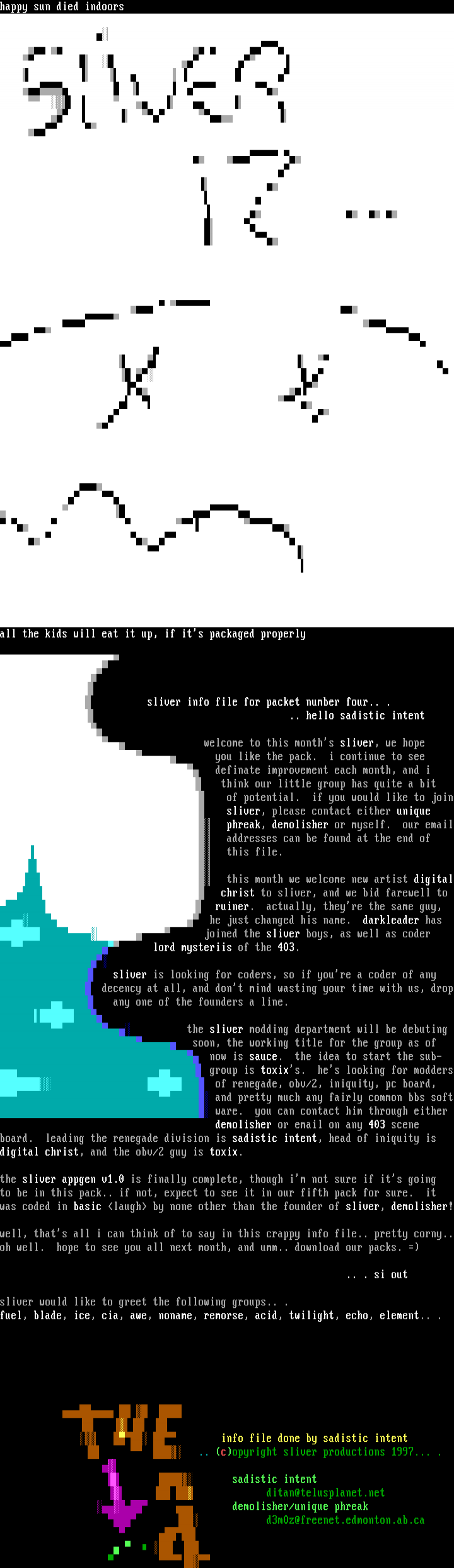 and pretty much any fairly common bbs soft ware. you can contact him through either demolisher or email on any 403 scene board. leading the renegade division is sadistic intent, head of iniquity is