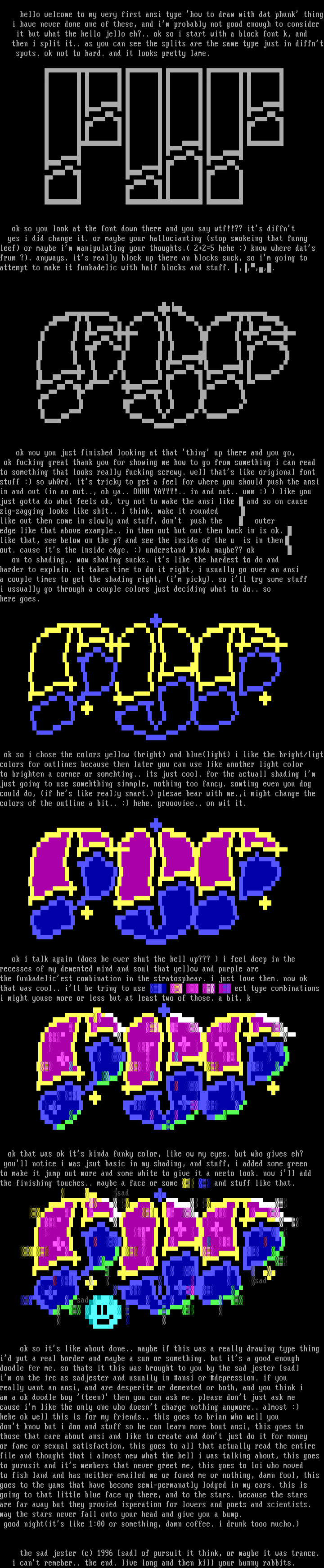 hello welcome to my very first ansi type how to draw with dat phunk thing i have never done one of these, and im probably not good enough to consider it but what the hello jello eh?.. ok so i start with a block font k, and