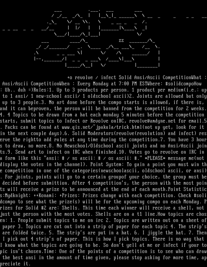 +o revolve / infect Solid Ansi/Ascii Competition What : Ansi/Ascii Competition When : Every Monday at 7:00 PM EST Where: solidcompo How : Uh.. duh Rules: 1. Up to 3 products per person. 1 product per mediumi.e.: up to 1 ansi/ 1 new- school ascii/ 1 oldschool ascii 2. Joints are allowed but only up to 3 people. 3. No art done before the compo starts is allowed, if there is, and it can be proven, the person will be banned from the competition for 2 weeks. 4. 4 Topics to be drawn from a hat each monday 5 minutes before the competition starts, submit topics to Infect or Revolve on IRC, revolve@amdyne.net for email. 5. Packs can be found at www.qis.net/jpakula/trick.htmlnot up yet, look for it in the next couple days. 6. Solid Moderatorsrevolverevolution and infect reserve the right to add rules at any time during the competition. 7. You have 3 hours to draw, no more. 8. No Newschool/Oldschool ascii joints and no Ansi/Ascii joints. 9. Send art to infect on IRC when finished. 10. Votes go to revolve on IRC in a form like this ansi: / ns ascii: / os ascii: . *PLEASE* message menot display the votes in the channel. Point System: To gain a point you must win the competition in one of the categoriesnewschoolascii, oldschool ascii, or ansi. For joints, points will go to a certain group of your choice, the group must be decided before submittion. After 4 competitions, the person with the most points will receive a prize to be announced at the end of each month. Point Statistics: Mydknight: ++ Konami: + Prizes: Prizes change with each competition. Check solidcompo to see what the prizes will be for the upcoming compo on each Monday. Prizes for Solid 2 are: Shells. This time each winner will receive a shell, not just the person with the most votes. Shells are on a t1 line. How topics are chosen: 1. People submit topics to me on irc 2. Topics are written out on a sheet of paper 3. Topics are cut out into a strip of paper for each topic 4. The strips are folded twice. 5. The strips are put in a hat. 6. I jiggle the hat. 7. Then I pick out 4 strips of paper. This is how I pick topics. There is no way that I know what the topics are going to be. So dont yell at me or infect if your topic isnt chosen. Time: One of the points of a competition is to see who can draw the best ansi in the amount of time given, please stop asking for more time, appreciate it.