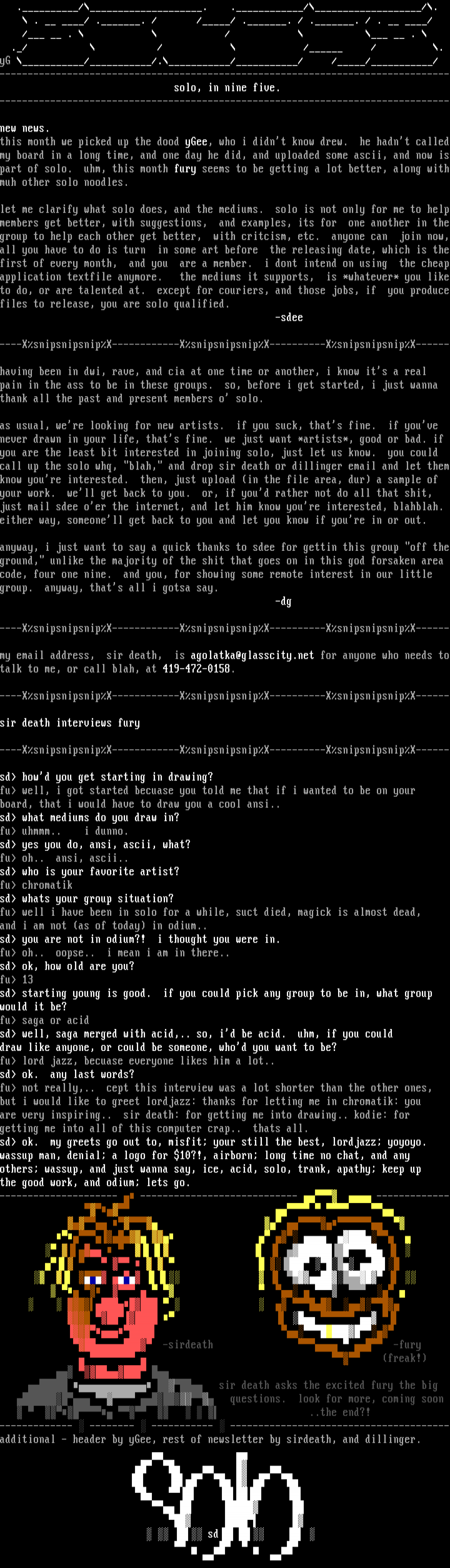 this month we picked up the dood yGee, who i didnt know drew. he hadnt calledmy board in a long time, and one day he did, and uploaded some ascii, and now ispart of solo. uhm, this month fury seems to be getting a lot better, along withmuh other solo noodles.