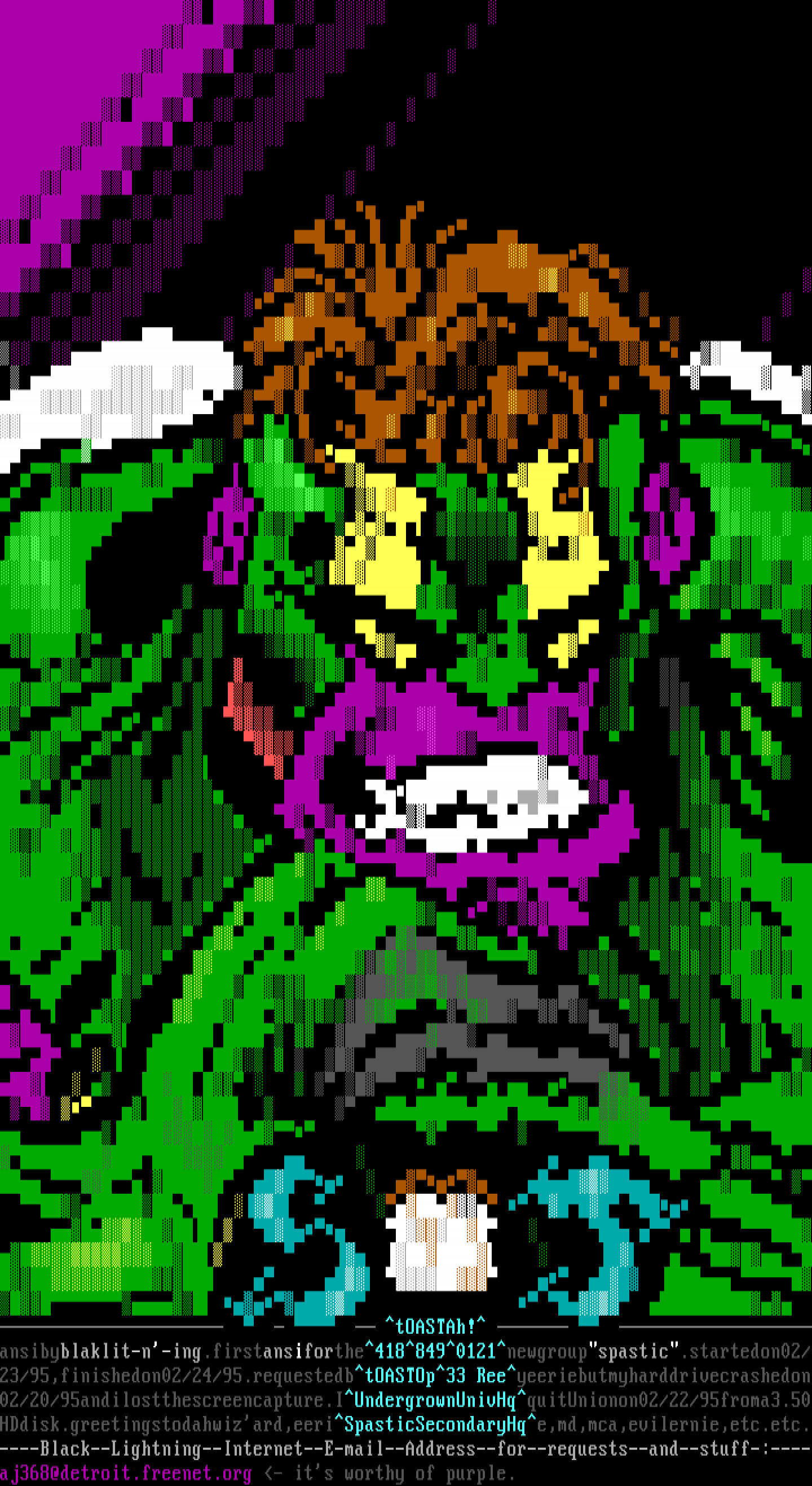 tOASTAh! ansibyblaklit-n-ing.firstansiforthe4188490121newgroupspastic.startedon02/23/95,finishedon02/24/95.requestedbtOASTOp33 Reeyeeriebutmyharddrivecrashedon02/20/95andilostthescreencapture.IUndergrownUnivHqquitUnionon02/22/95froma3.50HDdisk.greetingstodahwizard,eeriSpasticSecondaryHqe,md,mca,evilernie,etc.etc.----Black--Lightning--Internet--E-mail--Address--for--requests--and--stuff-:----aj368@detroit.freenet.org - its worthy of purple.