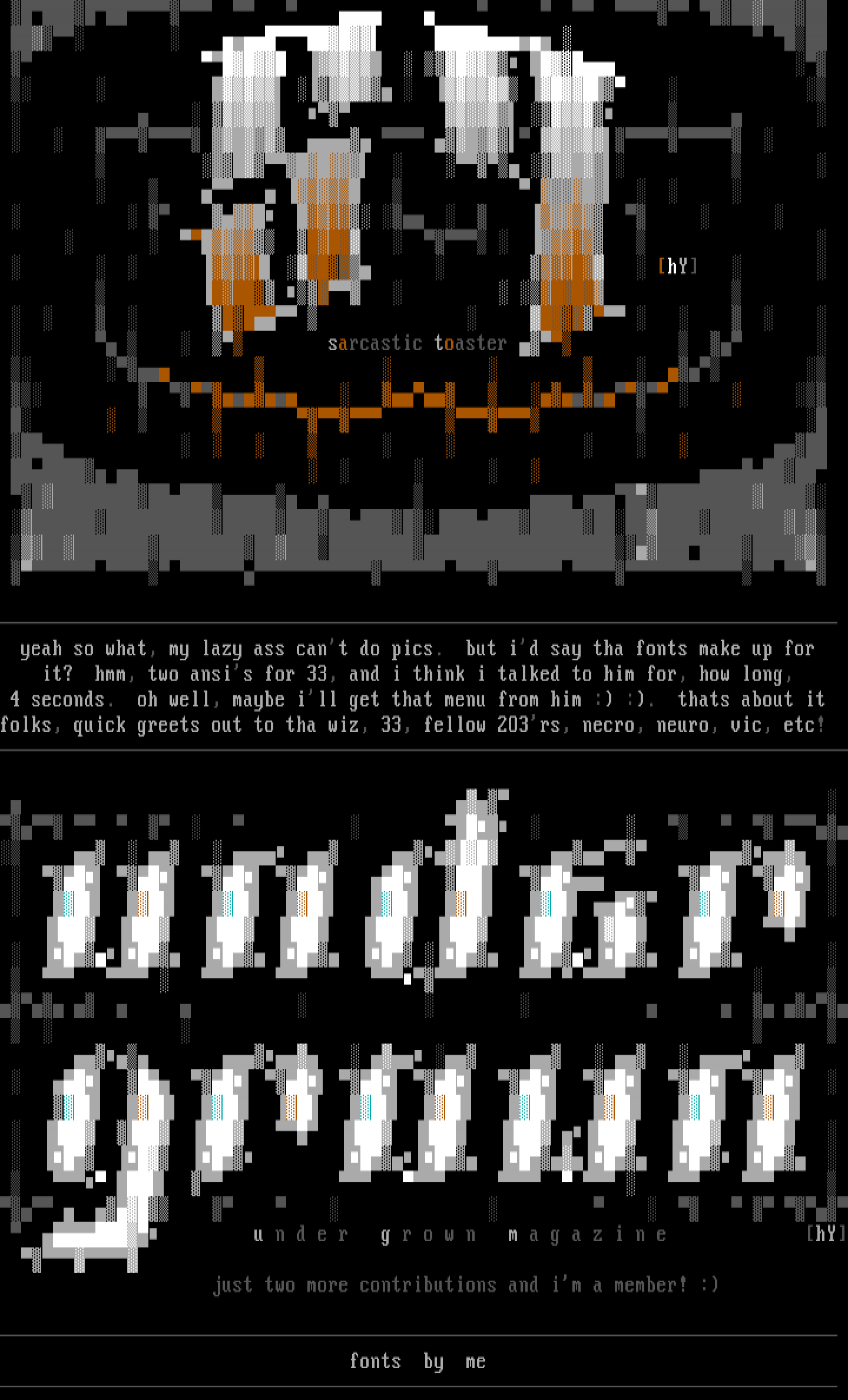 folks, quick greets out to tha wiz, 33, fellow 2O3rs, necro, neuro, vic, etc!