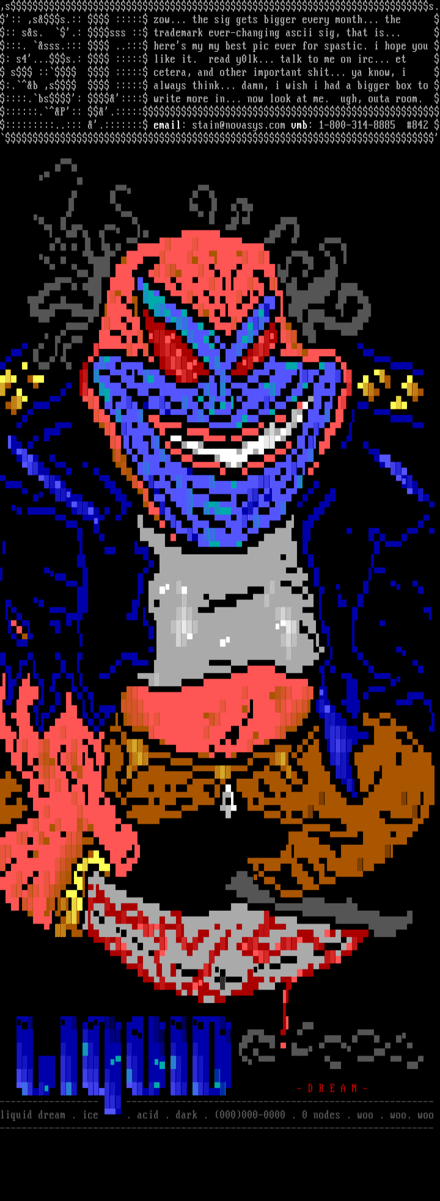 ,ss.:: ,ss.:: ::::: zow... the sig gets bigger every month... the :: ss. .: sss :: trademark ever-changing ascii sig, that is... :::. sss.::: ..::: heres my my best pic ever for spastic. i hope you : s4...s.: ::::: like it. read y0lk... talk to me on irc... et s :: ::::: cetera, and other important shit... ya know, i :.b ,s ::::: always think... damn, i wish i had a bigger box to ::::.bs: :::: write more in... now look at me. ugh, outa room. ::::::.P:: .::::::::::::::..::: .::::::: email: stain@novasys.com vmb: 1-800-314-8885 842