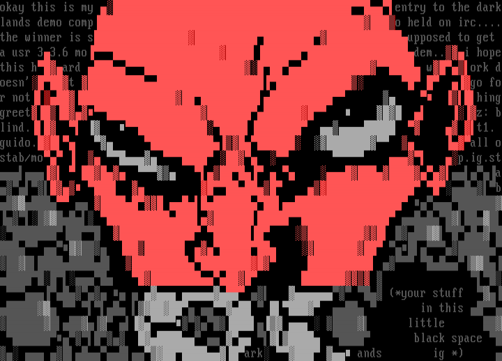 okay this is my entry to the darklands demo compo held on irc....the winner is supposed to get a usr 33.6 modem..i hopethis hard work doesnt go for not hinggreet z: blind. t1. guido. all ostab/mo p.ig.st a b