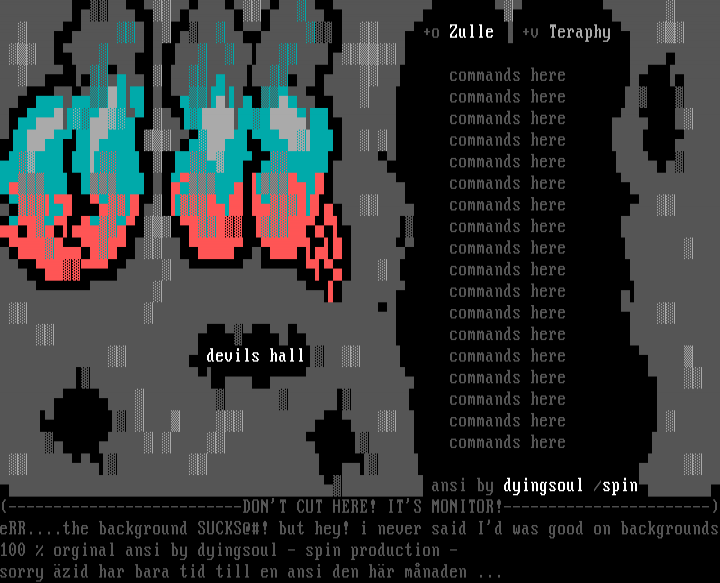 +o Zulle +v Teraphy commands here commands here commands here commands here commands here commands here commands here commands here commands here commands here commands here commands here commands here devils hall commands here commands here commands here commands here commands here ansi by dyingsoul /spin--------------------------DONT CUT HERE! ITS MONITOR!-----------------------eRR....the background SUCKS@! but hey! i never said Id was good on backgrounds100 orginal ansi by dyingsoul - spin production -