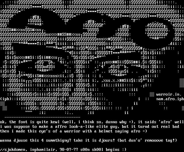 ok, the font is quite kewl well, i think so, dunno why , it saids afro welli was suppose to make a affro look-a-like elite guy, but it turnd out real bad