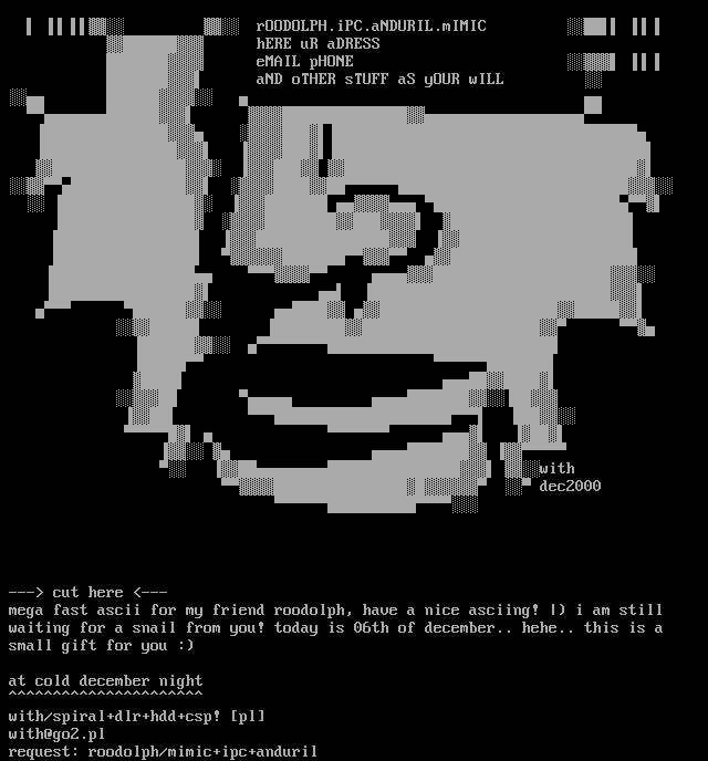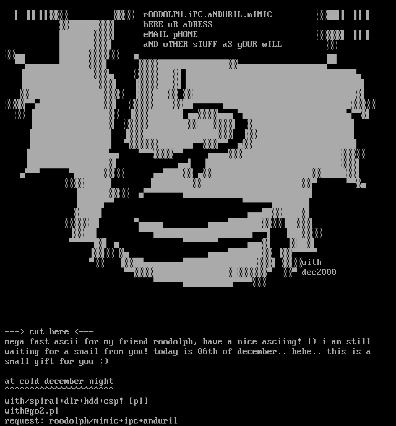 mega fast ascii for my friend roodolph, have a nice asciing! i am still