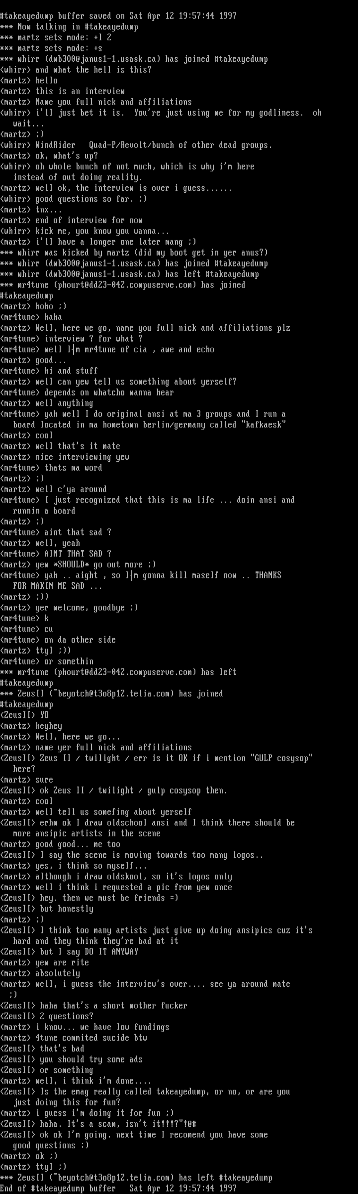 takeayedump buffer saved on Sat Apr 12 19:57:44 1997