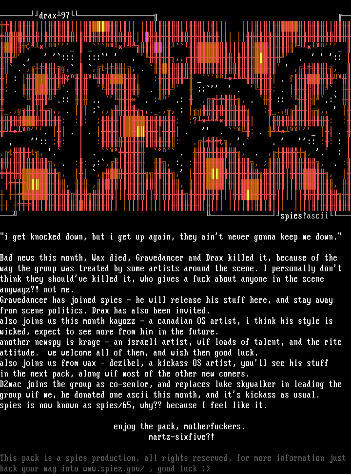 drax97 greets: gravedancer@4 * ** , ::: ::: . ,, . :: .,g, ,t, . ,, : : * . f . . . :: . : . . .:: .. * . : .: ,, . :: .: .,g,, . ,,,..,, : :.,g,, : :: :?** : :*. . . . . : . * . , :: : :: ,t, . . :: :: : ,tt, . . . , . ,, . : , . :: ,:, , :. :, , . :, ,, , , ,, , wax!ascii owns spies@ spies!ascii