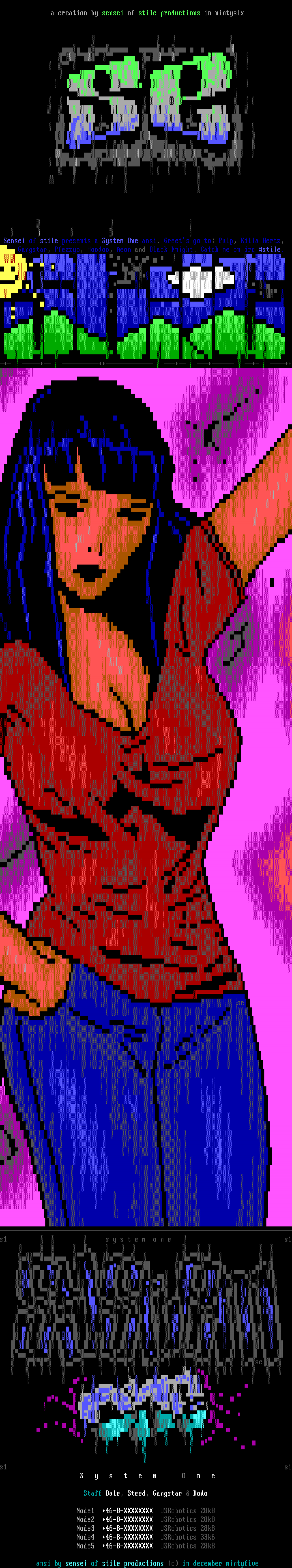 Sensei of stile presents a System One ansi. Greets go to: Pulp, Killa Hertz,