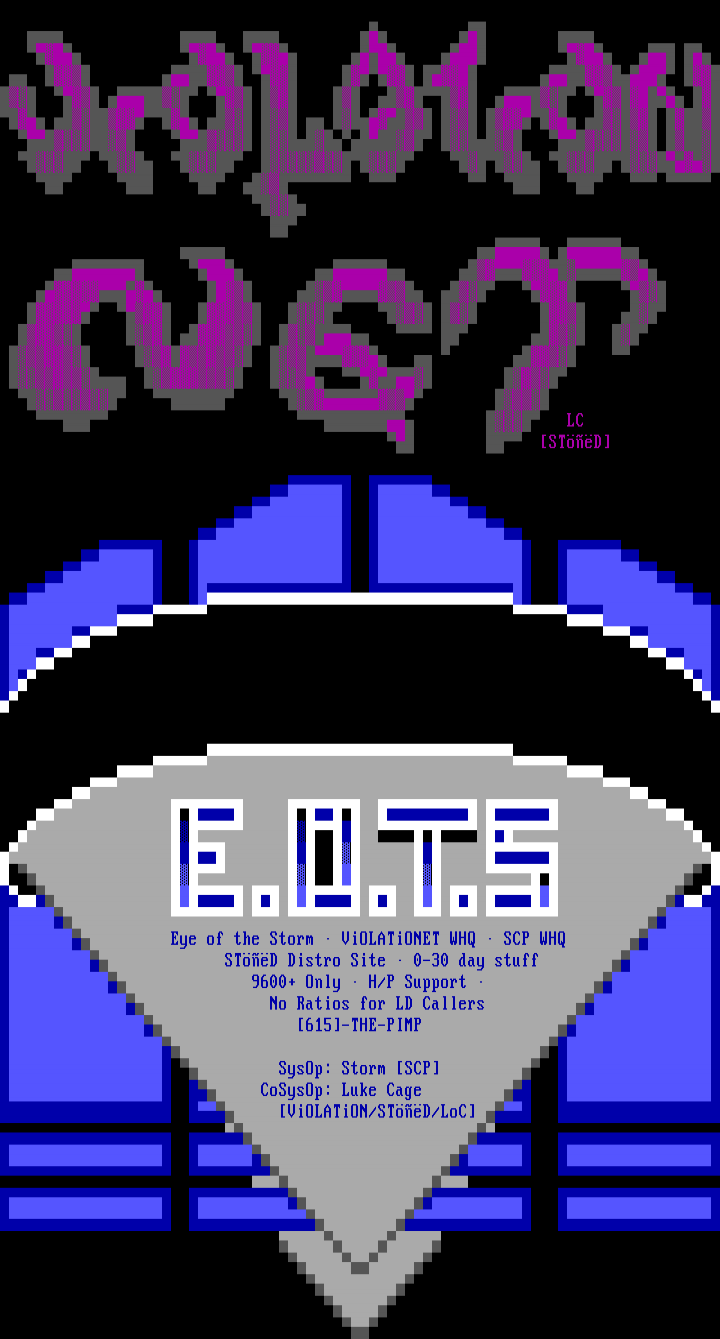 Eye of the Storm ViOLATiONET WHQ SCP WHQ STD Distro Site 0-30 day stuff 9600+ Only H/P Support No Ratios for LD Callers 615-THE-PIMP SysOp: Storm SCP CoSysOp: Luke Cage ViOLATiON/STD/LoC