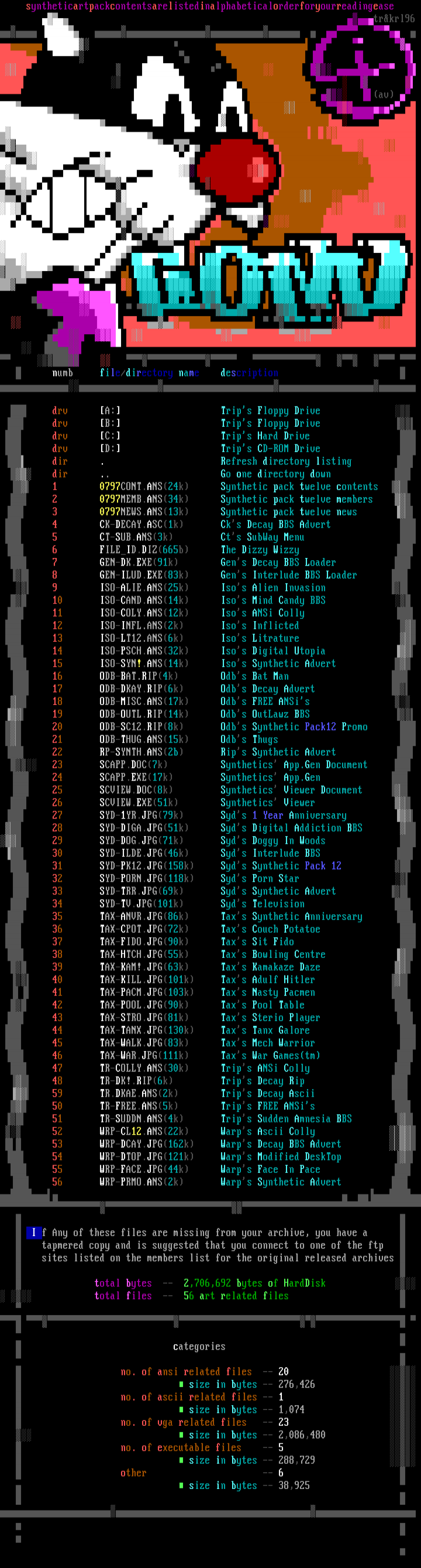 drv A: Trips Floppy Drive drv B: Trips Floppy Drive drv C: Trips Hard Drive drv D: Trips CD-ROM Drive dir . Refresh directory listing dir .. Go one directory down 1 0797CONT.ANS24k Synthetic pack twelve contents 2 0797MEMB.ANS34k Synthetic pack twelve members 3 0797NEWS.ANS13k Synthetic pack twelve news 4 CK-DECAY.ASC1k Cks Decay BBS Advert 5 CT-SUB.ANS3k Cts SubWay Menu 6 FILEID.DIZ665b The Dizzy Wizzy 7 GEN-DK.EXE91k Gens Decay BBS Loader 8 GEN-ILUD.EXE83k Gens Interlude BBS Loader 9 ISO-ALIE.ANS25k Isos Alien Invasion 10 ISO-CAND.ANS14k Isos Mind Candy BBS 11 ISO-COLY.ANS12k Isos ANSi Colly 12 ISO-INFL.ANS2k Isos Inflicted 13 ISO-LT12.ANS6k Isos Litrature 14 ISO-PSCH.ANS32k Isos Digital Utopia 15 ISO-SYN!.ANS14k Isos Synthetic Advert 16 ODB-BAT.RIP4k Odbs Bat Man 17 ODB-DKAY.RIP6k Odbs Decay Advert 18 ODB-MISC.ANS17k Odbs FREE ANSis 19 ODB-OUTL.RIP14k Odbs OutLawz BBS 20 ODB-SC12.RIP8k Odbs Synthetic Pack12 Promo 21 ODB-THUG.ANS15k Odbs Thugs 22 RP-SYNTH.ANS2b Rips Synthetic Advert 23 SCAPP.DOC7k Synthetics App.Gen Document 24 SCAPP.EXE17k Synthetics App.Gen 25 SCVIEW.DOC8k Synthetics Viewer Document 26 SCVIEW.EXE51k Synthetics Viewer 27 SYD-1YR.JPG79k Syds 1 Year Anniversary 28 SYD-DIGA.JPG51k Syds Digital Addiction BBS 29 SYD-DOG.JPG71k Syds Doggy In Woods 30 SYD-ILDE.JPG46k Syds Interlude BBS 31 SYD-PK12.JPG158k Syds Synthetic Pack 12 32 SYD-PORN.JPG118k Syds Porn Star 33 SYD-TRR.JPG69k Syds Synthetic Advert 34 SYD-TV.JPG101k Syds Television 35 TAX-ANVR.JPG86k Taxs Synthetic Anniversary 36 TAX-CPOT.JPG72k Taxs Couch Potatoe 37 TAX-FIDO.JPG90k Taxs Sit Fido 38 TAX-HTCH.JPG55k Taxs Bowling Centre 39 TAX-KAM!.JPG63k Taxs Kamakaze Daze 40 TAX-KILL.JPG101k Taxs Adulf Hitler 41 TAX-PACM.JPG103k Taxs Nasty Pacmen 42 TAX-POOL.JPG90k Taxs Pool Table 43 TAX-STRO.JPG81k Taxs Sterio Player 44 TAX-TANX.JPG130k Taxs Tanx Galore 45 TAX-WALK.JPG83k Taxs Mech Warrior 46 TAX-WAR.JPG111k Taxs War Gamestm 47 TR-COLLY.ANS30k Trips ANSi Colly 48 TR-DK!.RIP6k Trips Decay Rip 59 TR.DKAE.ANS2k Trips Decay Ascii 50 TR-FREE.ANS5k Trips FREE ANSis 51 TR-SUDDN.ANS4k Trips Sudden Amnesia BBS 52 WRP-CL12.ANS22k Warps Ascii Colly 53 WRP-DCAY.JPG162k Warps Decay BBS Advert 54 WRP-DTOP.JPG121k Warps Modified DeskTop 55 WRP-FACE.JPG44k Warps Face In Pace 56 WRP-PRMO.ANS2k Warps Synthetic Advert
