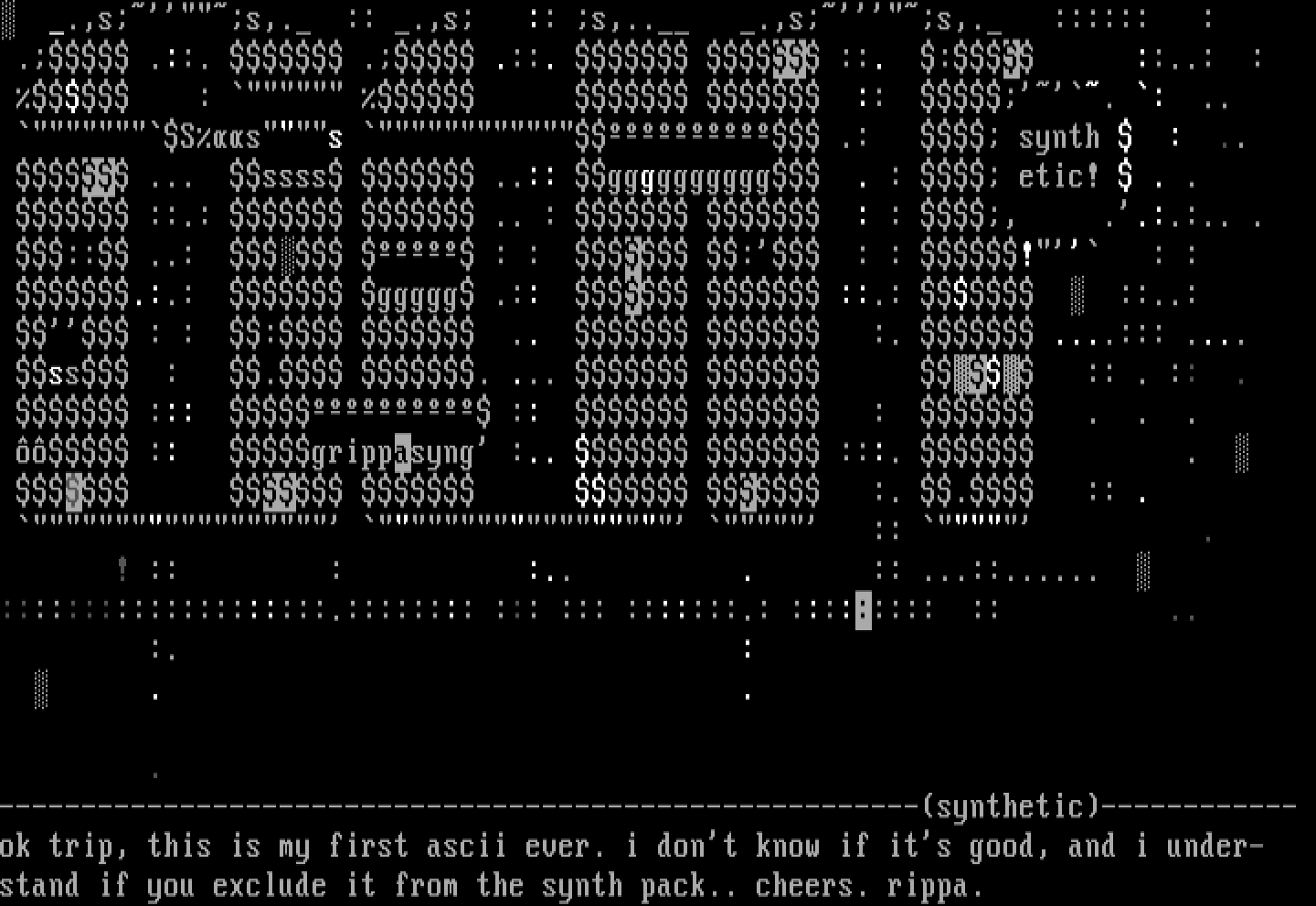 --------------------------------------------------------synthetic------------ ok trip, this is my first ascii ever. i dont know if its good, and i under-