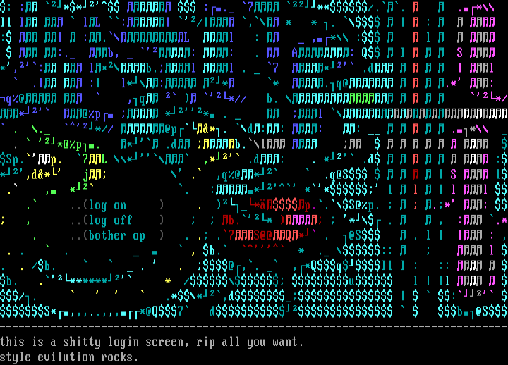 q@ ,q *// b. */* @p ** . l . . *// @p*. d:: : : .* . *@p. * .d b.l Sp.p. 7L * ,* .d: . * .d :*,d* j . ,q@* .q@S I S l . , * . :* ** l l l l l . ..log on . *p..S@p. .* : , ..log off b.* * . , : .* . ..bother op . . .7S@@Q* . @S . l l : , . . . , b. * . :: l . . /b. . . @,. ,*Qqll l : :: b. .****** * / u l ll /. .**,d : S*,,,..,,,*@Q7 d b@S--------------------------------------------------------------------------------this is a shitty login screen, rip all you want.