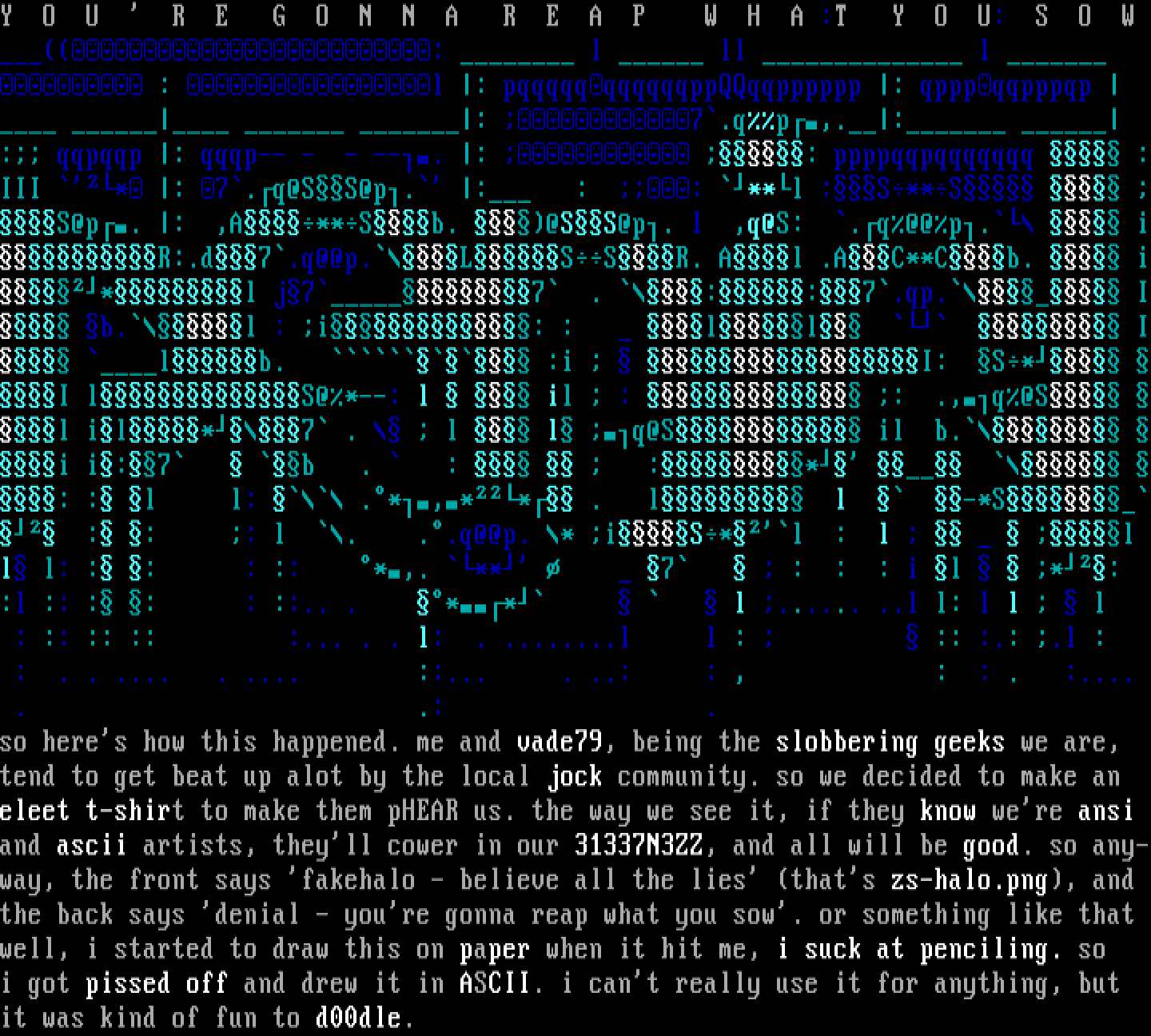 and ascii artists, theyll cower in our 31337N3ZZ, and all will be good. so any-way, the front says fakehalo - believe all the lies thats zs-halo.png, and