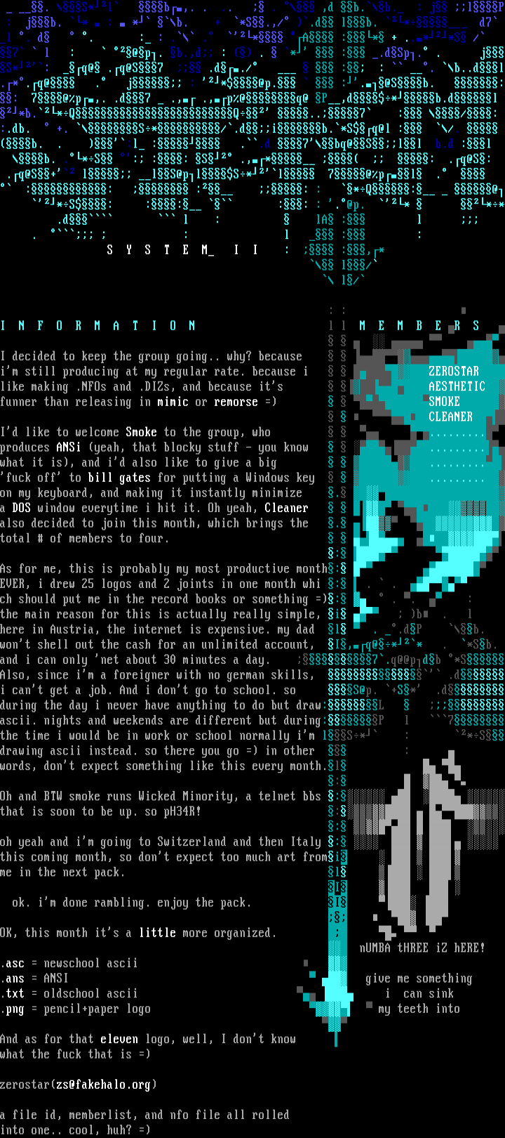 I decided to keep the group going.. why? because im still producing at my regular rate. because i ZEROSTAR like making .NFOs and .DIZs, and because its AESTHETIC funner than releasing in mimic or remorse SMOKE CLEANER Id like to welcome Smoke to the group, who .........