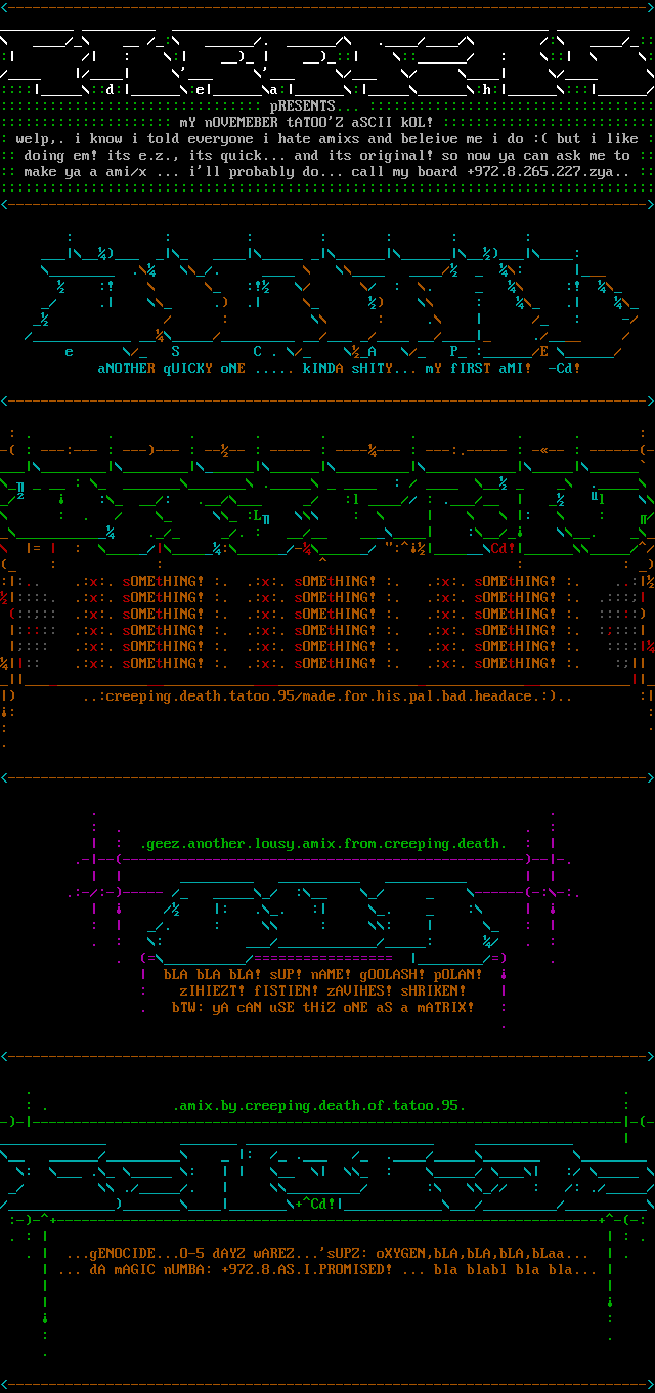 / /: /. / .// /: /::: / : : :: ::/ : :: :/ / / / / ::::::d::ea:::h::::/:::::::::::::::::::::::::::::::: pRESENTS... :::::::::::::::::::::::::::::::::::::::::::::::::::::::: mY nOVEMEBER tATOOZ aSCII kOL! ::::::::::::::::::::::::::: welp,. i know i told everyone i hate amixs and beleive me i do : but i like ::: doing em! its e.z., its quick... and its original! so now ya can ask me to :::: make ya a ami/x ... ill probably do... call my board +972.8.265.227.zya.. ::::::::::::::::::::::::::::::::::::::::::::::::::::::::::::::::::::::::::::::::::------------------------------------------------------------------------------