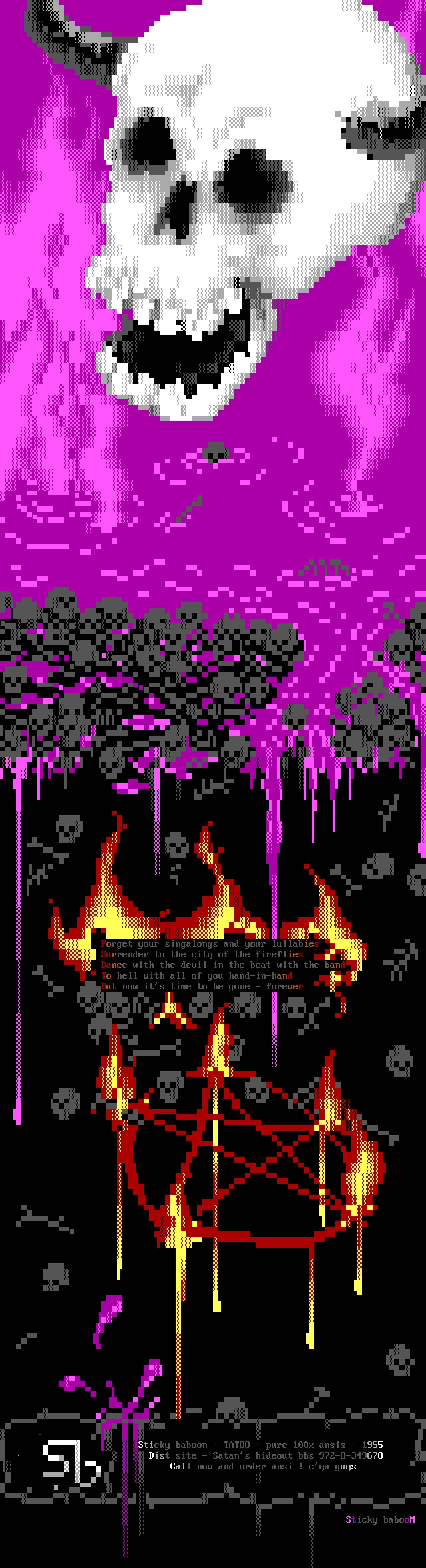 Dist site - Satans hideout bbs 972-8-349678 Call now and order ansi ! cya guys