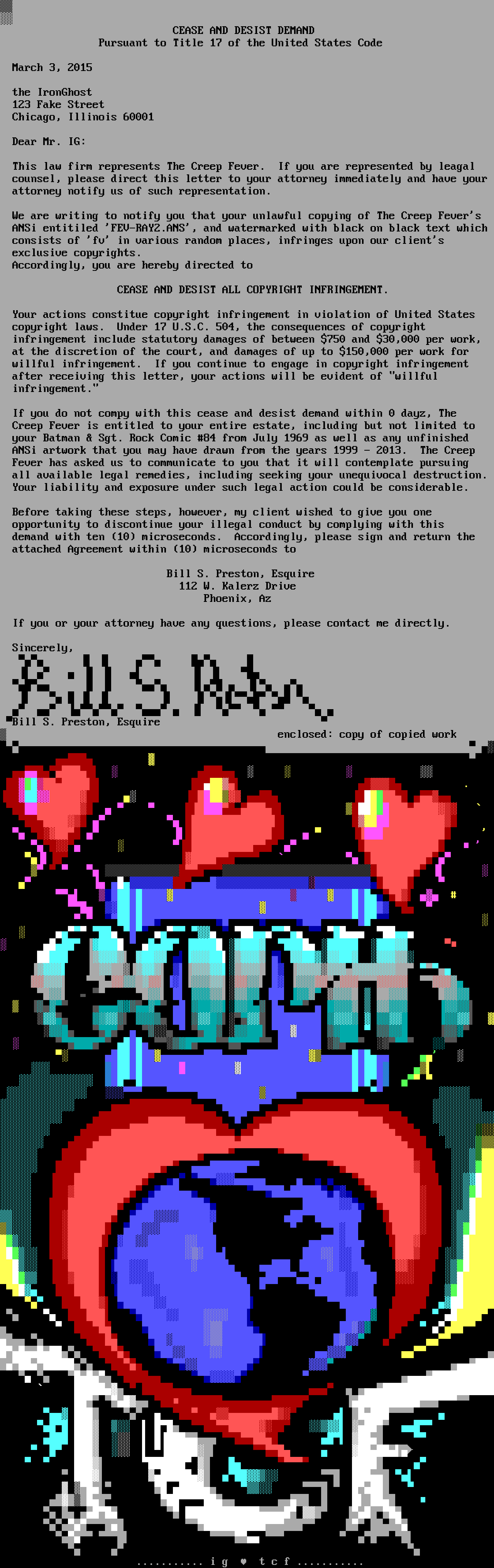 CEASE AND DESIST DEMAND Pursuant to Title 17 of the United States Code March 3, 2015 the IronGhost 123 Fake Street Chicago, Illinois 60001 Dear Mr. IG: This law firm represents The Creep Fever. If you are represented by leagal counsel, please direct this letter to your attorney immediately and have your attorney notify us of such representation. We are writing to notify you that your unlawful copying of The Creep Fevers ANSi entitiled FEV-RAY2.ANS, and watermarked with black on black text which consists of fv in various random places, infringes upon our clients exclusive copyrights. Accordingly, you are hereby directed to CEASE AND DESIST ALL COPYRIGHT INFRINGEMENT. Your actions constitue copyright infringement in violation of United States copyright laws. Under 17 U.S.C. 504, the consequences of copyright infringement include statutory damages of between 750 and 30,000 per work, at the discretion of the court, and damages of up to 150,000 per work for willful infringement. If you continue to engage in copyright infringement after receiving this letter, your actions will be evident of willful infringement. If you do not compy with this cease and desist demand within 0 dayz, The Creep Fever is entitled to your entire estate, including but not limited to your Batman Sgt. Rock Comic 84 from July 1969 as well as any unfinished ANSi artwork that you may have drawn from the years 1999 - 2013. The Creep Fever has asked us to communicate to you that it will contemplate pursuing all available legal remedies, including seeking your unequivocal destruction. Your liability and exposure under such legal action could be considerable. Before taking these steps, however, my client wished to give you one opportunity to discontinue your illegal conduct by complying with this demand with ten 10 microseconds. Accordingly, please sign and return the attached Agreement within 10 microseconds to Bill S. Preston, Esquire 112 W. Kalerz Drive Phoenix, Az If you or your attorney have any questions, please contact me directly. Sincerely, Bill S. Preston, Esquire enclosed: copy of copied work