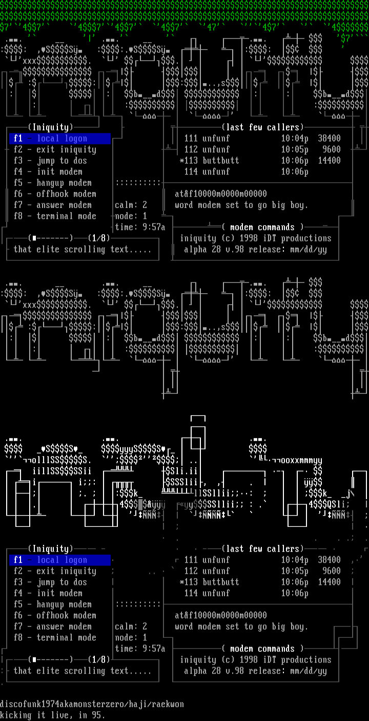 olllSSS. .. ooxxmmmyy iillSSSSii Sli.ii - - i i: SSSlii, , . . :k llSSllii: k j . 4 yySSllii : . 4QSli . . . . . Iniquity-- - -last few callers-- f1 - local logon 111 unfunf 10:04p 38400 , f2 - exit iniquity .. 112 unfunf 10:05p 9600 f3 - jump to dos *113 buttbutt 10:06p 14400