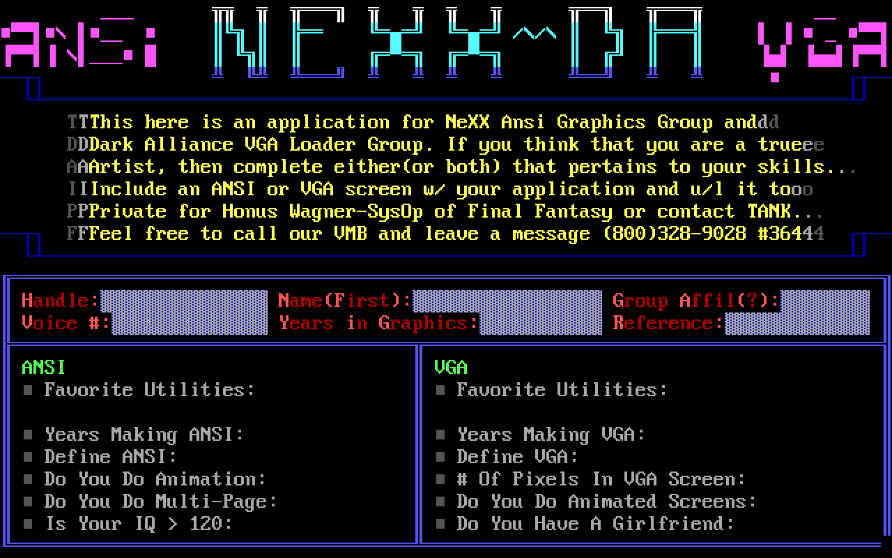 TThis here is an application for NeXX Ansi Graphics Group and