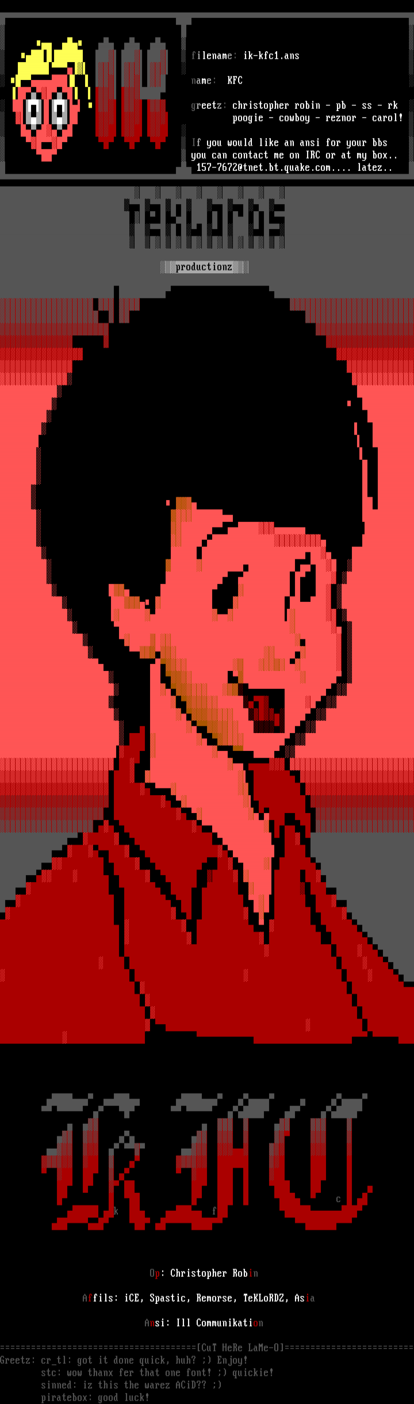 greetz: christopher robin - pb - ss - rk poogie - cowboy - reznor - carol! If you would like an ansi for your bbs you can contact me on IRC or at my box.. 157-7672@tnet.bt.quake.com.... latez.. productionz