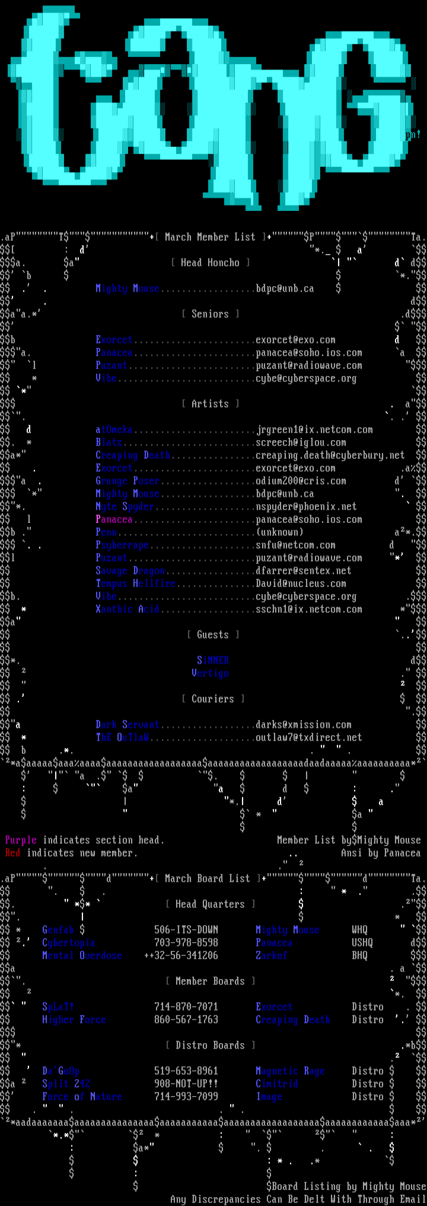 .aPT+ March Member List +PTa. : d *. a a. a Head Honcho d d b *. . . Mighty Mouse..................bdpc@unb.ca . daa.* Seniors .d b Exorcet.......................exorcet@exo.com d a. Panacea.......................panacea@soho.ios.com a l Puzant........................puzant@radiowave.com * Vibe..........................cybe@cyberspace.org * Artists . a. . . d atOmeka.......................jrgreen1@ix.netcom.com . * Blatz.........................screech@iglou.com a* Creaping Death................creaping.death@cyberbury.net . Exorcet.......................exorcet@exo.com .aa . Grunge Poser..................odium200@cris.com d * Mighty Mouse..................bdpc@unb.ca . *. Nyte Spyder...................nspyder@phoenix.net l Panacea.......................panacea@soho.ios.com b . Penn..........................unknown a*. . . Psyberrape....................snfu@netcom.com d l Puzant........................puzant@radiowave.com * Savage Dragon.................dfarrer@sentex.net Tempus Hellfire...............David@nucleus.com b. Vibe..........................cybe@cyberspace.org . * Xanthic Acid..................sschn1@ix.netcom.com *a Guests .. *. SiNNER d Vertigo . . Couriers .a Dark Servant..................darks@xmission.com * ThE OuTlaW....................outlaw7@txdirect.net b .*. . . *aaaaaaaaaaaaaaaaaaaaaaaaaaaaaaaaaaaaaaaaaaaaaaaaadaadaaaaaaaaaaaaaaa* a . .