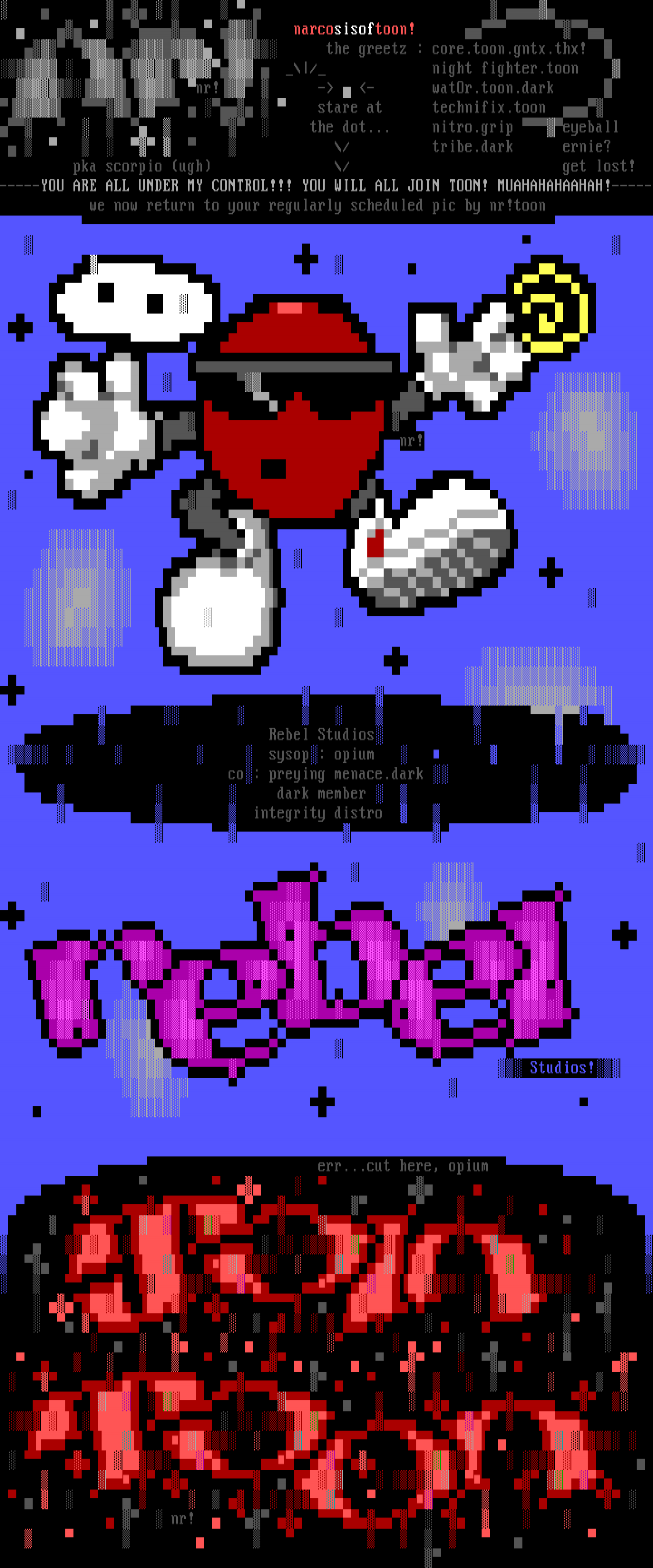 pka scorpio ugh / get lost! -----YOU ARE ALL UNDER MY CONTROL!!! YOU WILL ALL JOIN TOON! MUAHAHAHAAHAH!----- we now return to your regularly scheduled pic by nr!toon nr! Rebel Studios sysop: opium co: preying menace.dark dark member integrity distro Studios! err...cut here, opium