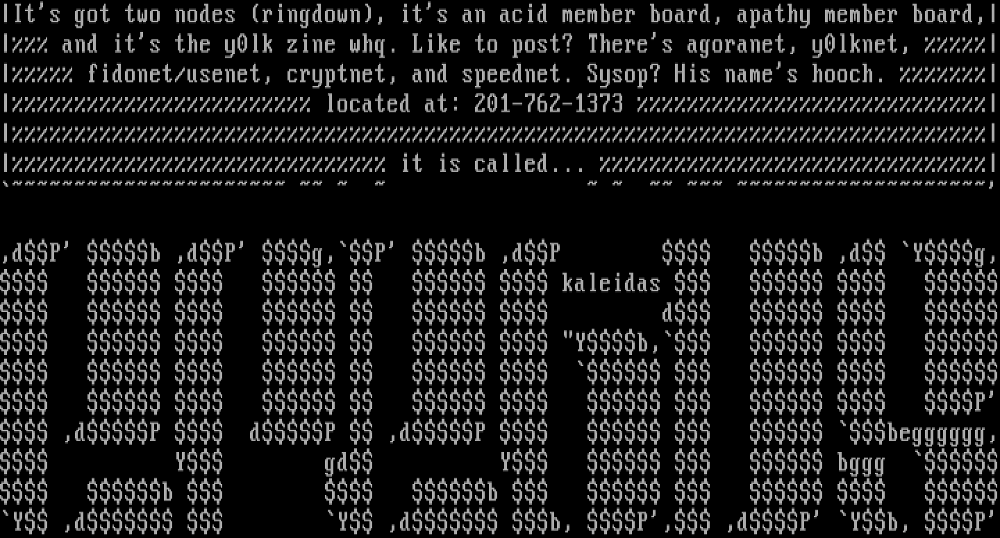 Its got two nodes ringdown, its an acid member board, apathy member board, and its the y0lk zine whq. Like to post? Theres agoranet, y0lknet, fidonet/usenet, cryptnet, and speednet. Sysop? His names hooch. located at: 201-762-1373 it is called...
