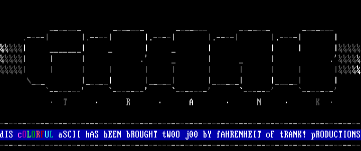 --------------------------------------------------------------------------------dIS cOLORFUL aSCII hAS bEEN bROUGHT tW0O j00 bY fAHRENHEIT oF tRANK! pRODUCTION
