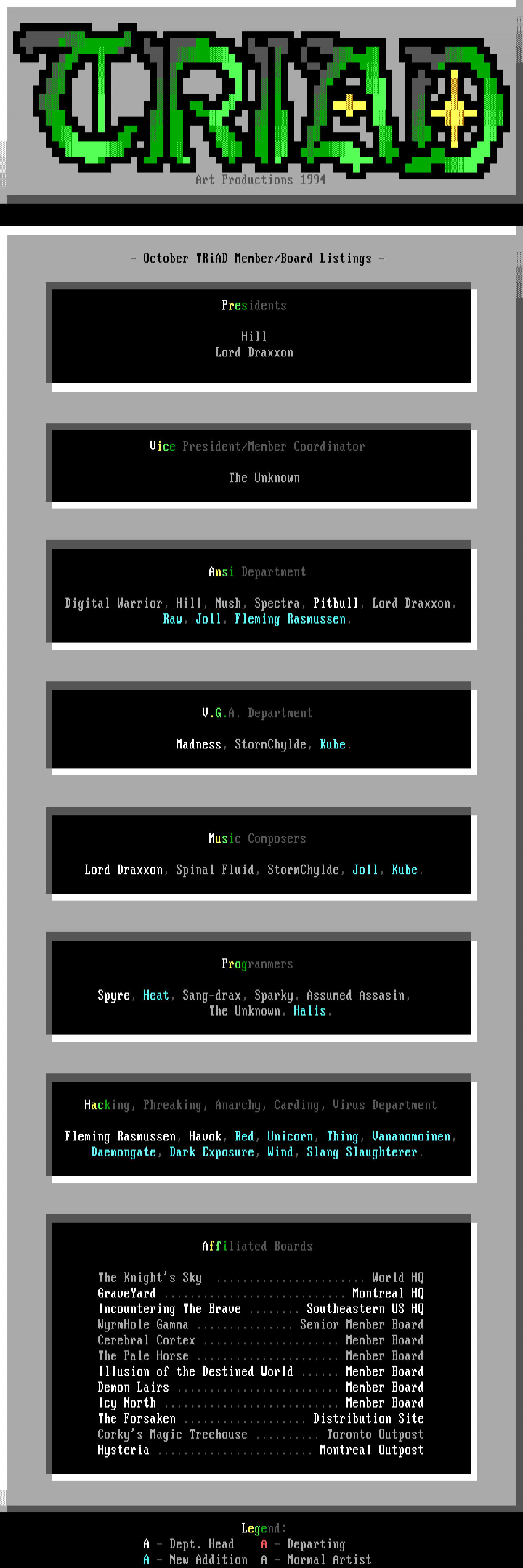 -October TRiAD Member/Board Listings- Presidents Hill Lord Draxxon Vice President/Member Coordinator The Unknown Ansi Department Digital Warrior, Hill, Mush, Spectra, Pitbull, Lord Draxxon, Raw, Joll, Fleming Rasmussen. V.G.A. Department Madness, StormChylde, Kube. Music Composers Lord Draxxon, Spinal Fluid, StormChylde, Joll, Kube. Programmers Spyre, Heat, Sang-drax, Sparky, Assumed Assasin, The Unknown, Halis. Hacking, Phreaking, Anarchy, Carding, Virus Department Fleming Rasmussen, Havok, Red, Unicorn, Thing, Vananomoinen, Daemongate, Dark Exposure, Wind, Slang Slaughterer. Affiliated Boards The Knights Sky ....................... World HQ GraveYard ............................ Montreal HQ Incountering The Brave ........ Southeastern US HQ WyrmHole Gamma ............... Senior Member Board Cerebral Cortex ..................... Member Board The Pale Horse ...................... Member Board Illusion of the Destined World ...... Member Board Demon Lairs ......................... Member Board Icy North ........................... Member Board The Forsaken ................... Distribution Site Corkys Magic Treehouse .......... Toronto Outpost Hysteria ........................ Montreal Outpost Legend: