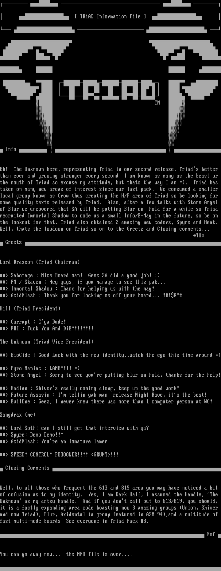 Well, thats the lowdown on Triad so on to the Greetz and Closing comments...