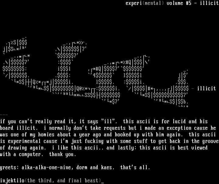 is experimental cause im just fucking with some stuff to get back in the grooveof drawing again. i like this ascii.. and lastly: this ascii is best viewed