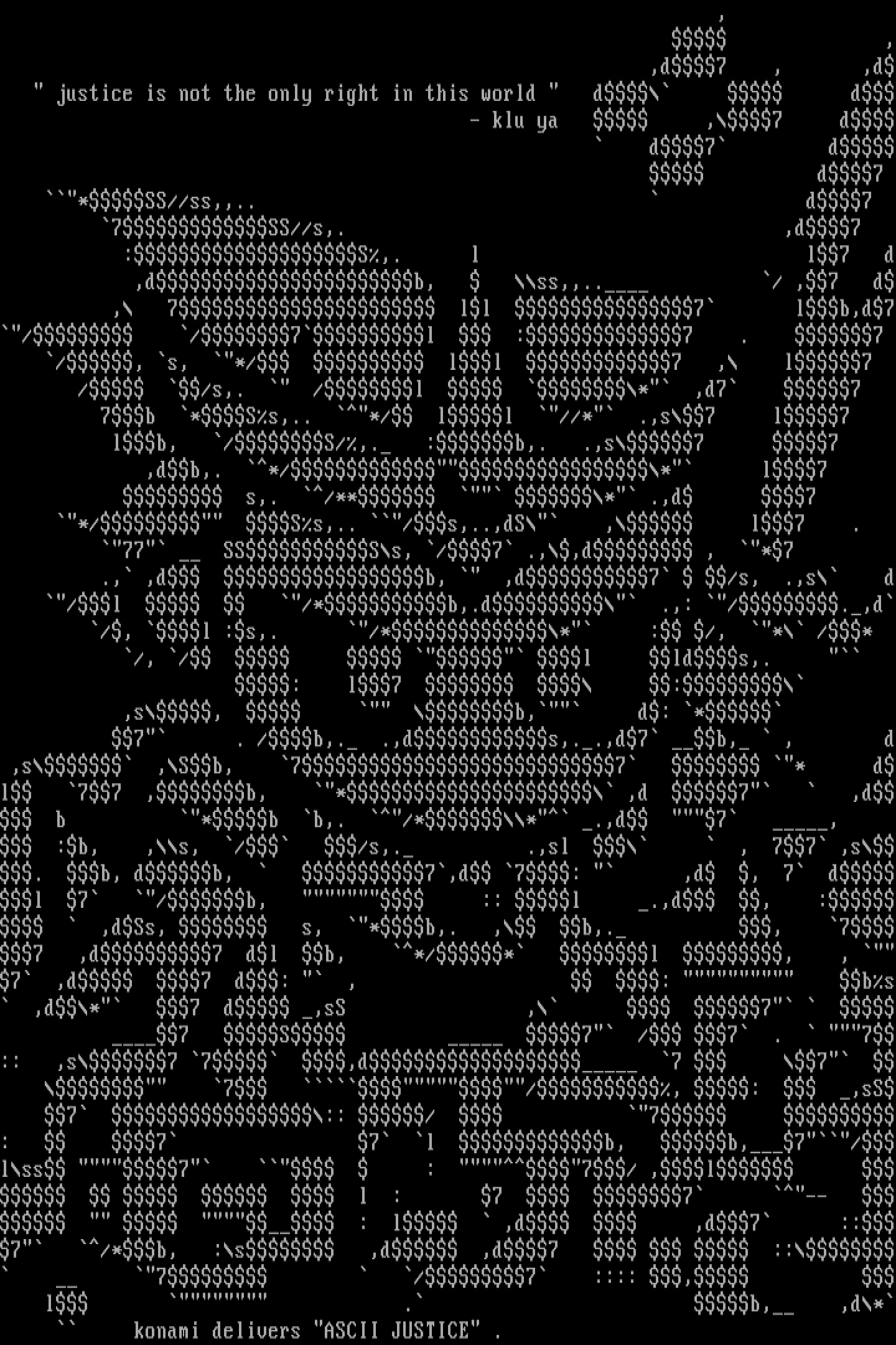 :b, ,s, / /s,. .,sl , 77 ,s. b, db, 7,d 7: ,d , 7 dl 7 /b, :: l .,d , : ,dSs, s, *b,. , b,. , 77 ,d7 dl b, */* l , , 7 ,d 7 d: , : bs ,d* 7 d ,sS , 7 7 S 7 / 7 . 7:: ,s7 7 ,d 7 7 7 /, : ,sS 7 :: / 7 : 7 7 l b, b,7/lss 7 : 7/ ,l l : 7 7 -- : l ,d ,d7 ::7 /*b, :s ,d ,d7 :: 7 /7 :::: , l . b, ,d* konami delivers ASCII JUSTICE .