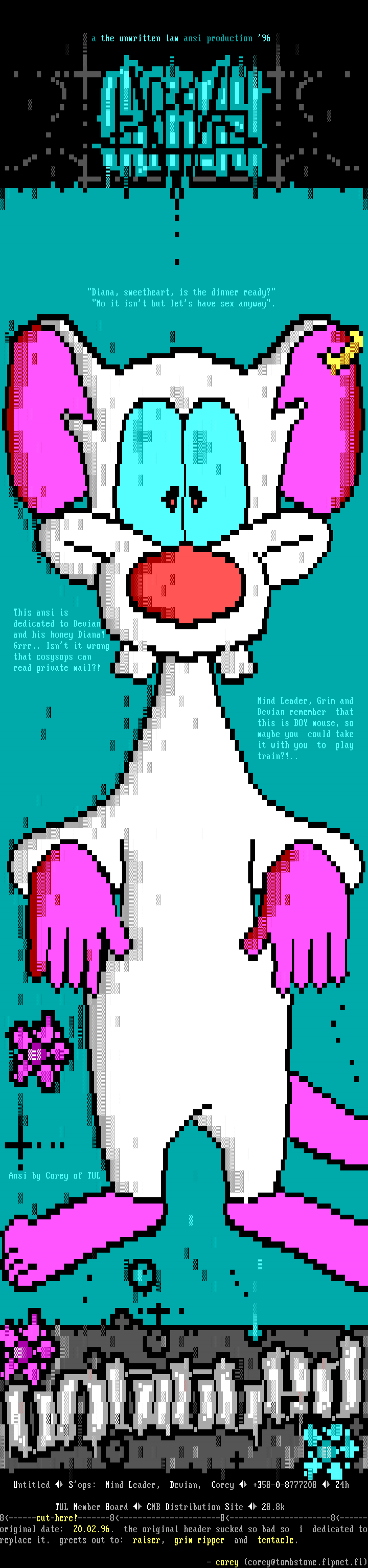 Diana, sweetheart, is the dinner ready?No it isnt but lets have sex anyway. This ansi is dedicated to Devian and his honey Diana! Grrr.. Isnt it wrong that cosysops can read private mail?! Mind Leader, Grim and Devian remember that this is BOY mouse, so maybe you could take it with you to play train?!.. Ansi by Corey of TUL