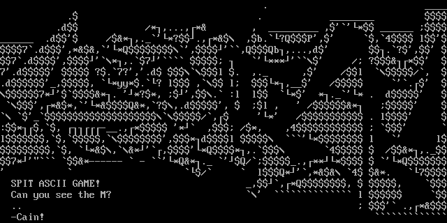 . . . .d /*,...,* , ,* .d /*,.*?.,* ,b.?QP, ,4 l7.d,*,*Q,,QQb,...,d .?, 7.d,*,.7 *** / ?* 7.d ?.7?,.d l . ,. , /l /, .d,, *yy*.? l , l *, / . 7**. *?*, ,. :l l * *.* . d ,**,*Q*,?,.d, l , /* /, * / . l :*,, -.,* * , /*, ,4 l,,,,*dl * l l,, *,*,*Q*,. 4 /*,.7* *------ - *Q*. Q/.,*** *Q / lQ*,* 4 *. 7 SPIT ASCII GAME! ,,*Q, , Can you see the M? l .. .,* -Cain!