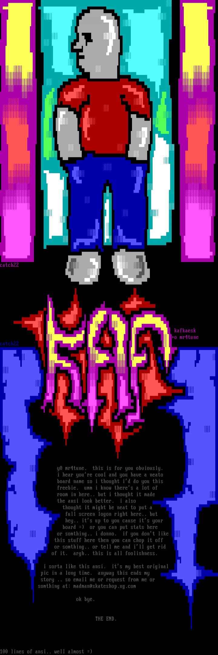 y0 mr4tune. this is for you obviously. i hear youre cool and you have a neato board name so i thought id do you this freebie. umm i know theres a lot of room in here.. but i thought it made the ansi look better. i also thought it might be neat to put a