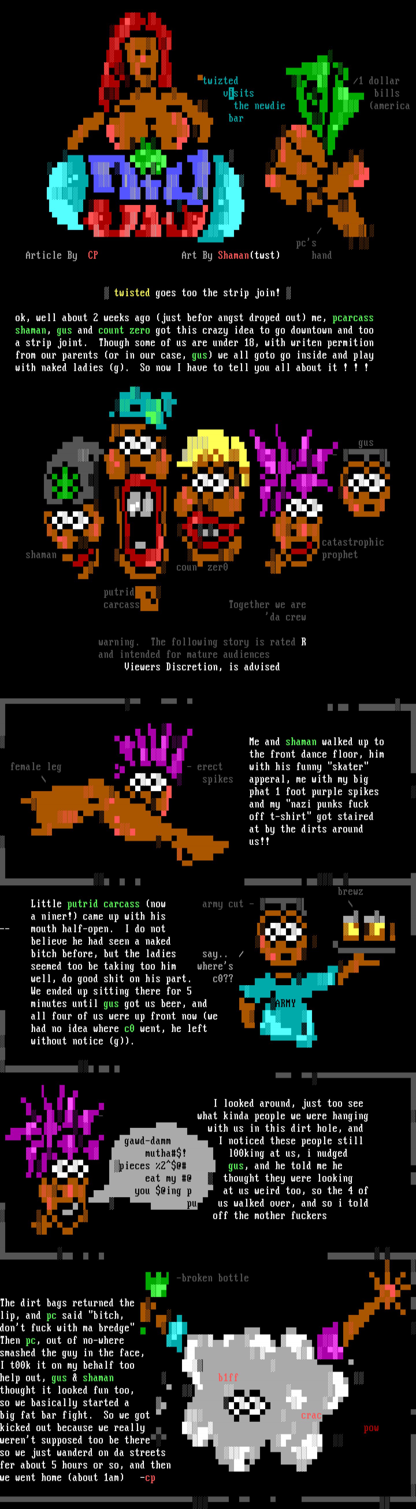 Me and shaman walked up to the front dance floor, him female leg - erect with his funny skater spikes apperal, me with my big