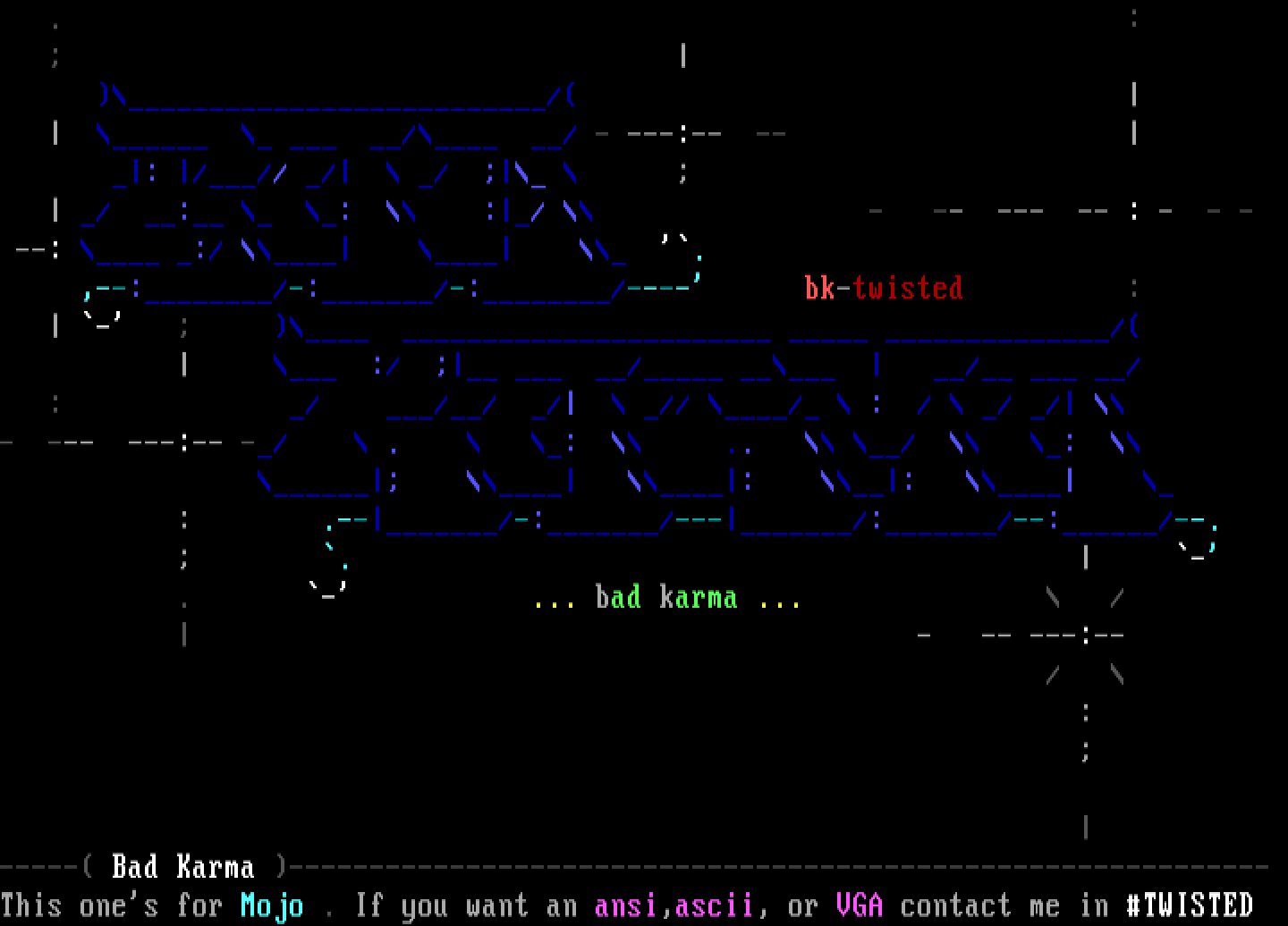 ----- Bad Karma ------------------------------------------------------------- This ones for Mojo . If you want an ansi,ascii, or VGA contact me in TWISTED