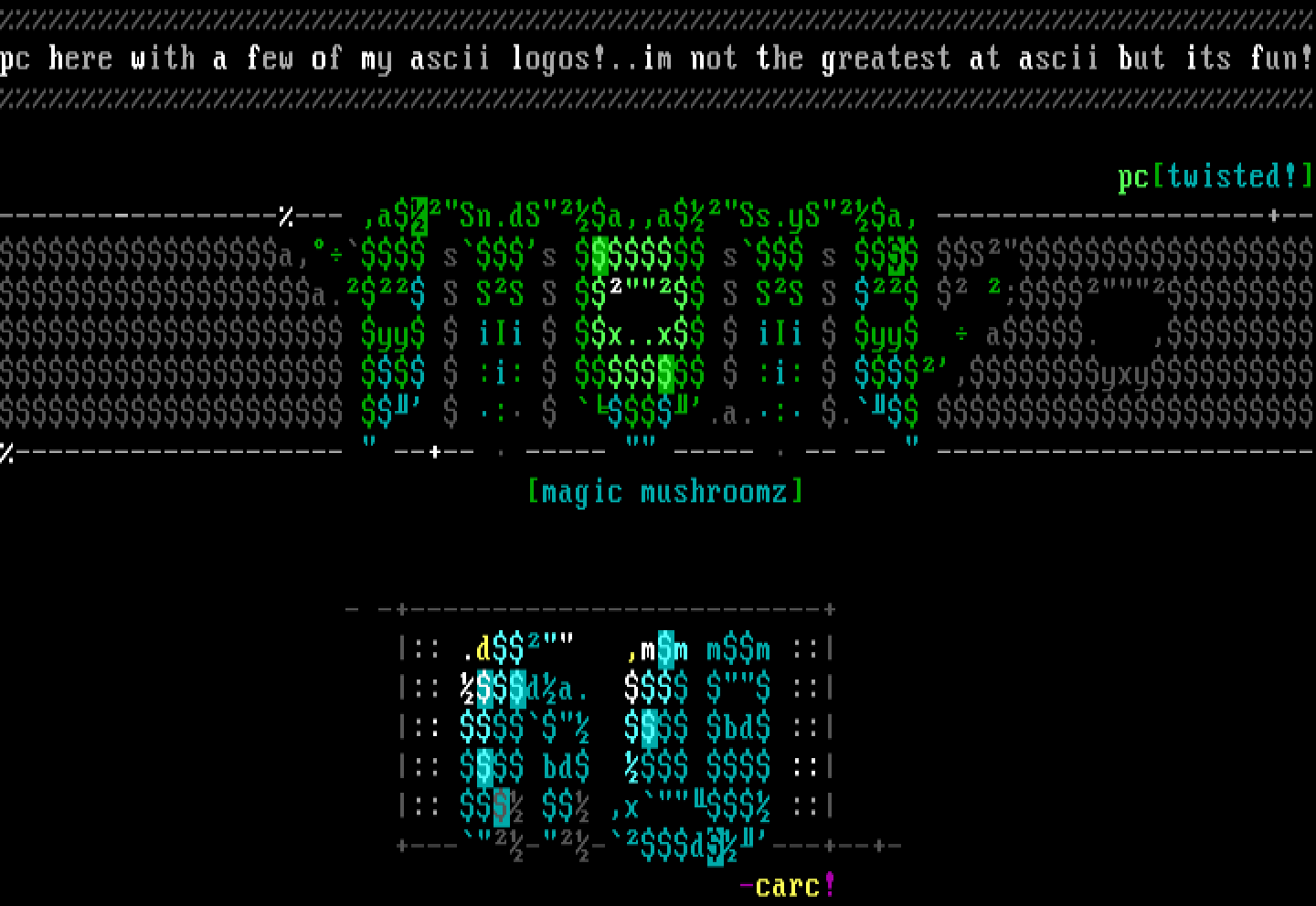 pc here with a few of my ascii logos!..im not the greatest at ascii but its fun!
