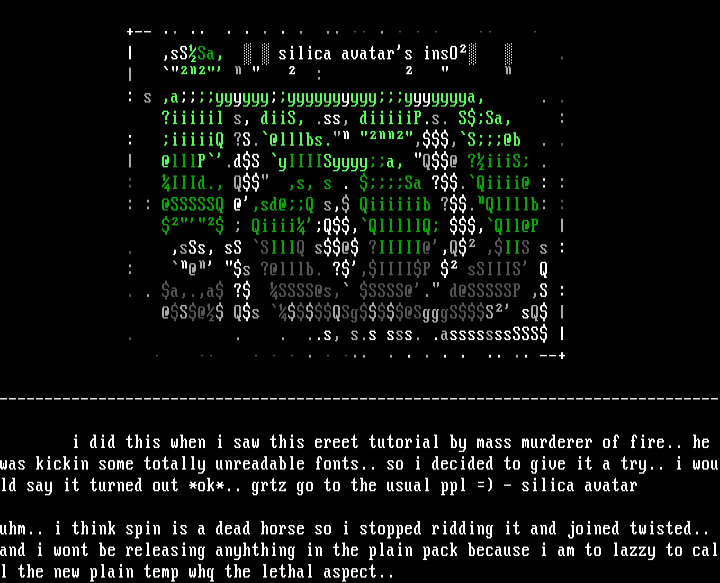 i did this when i saw this ereet tutorial by mass murderer of fire.. he was kickin some totally unreadable fonts.. so i decided to give it a try.. i would say it turned out *ok*.. grtz go to the usual ppl - silica avatar