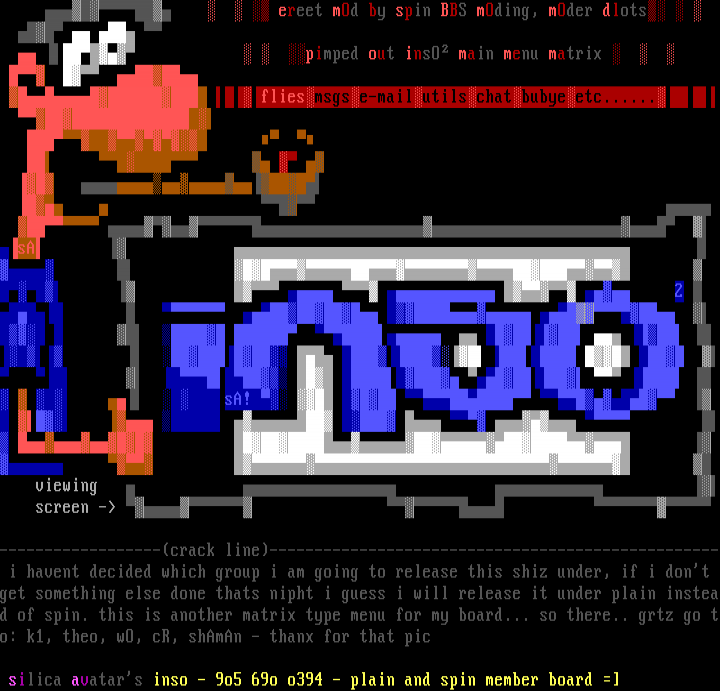 ------------------crack line-------------------------------------------------- i havent decided which group i am going to release this shiz under, if i dont get something else done thats nipht i guess i will release it under plain instead of spin. this is another matrix type menu for my board... so there.. grtz go to: k1, theo, wO, cR, shAmAn - thanx for that pic