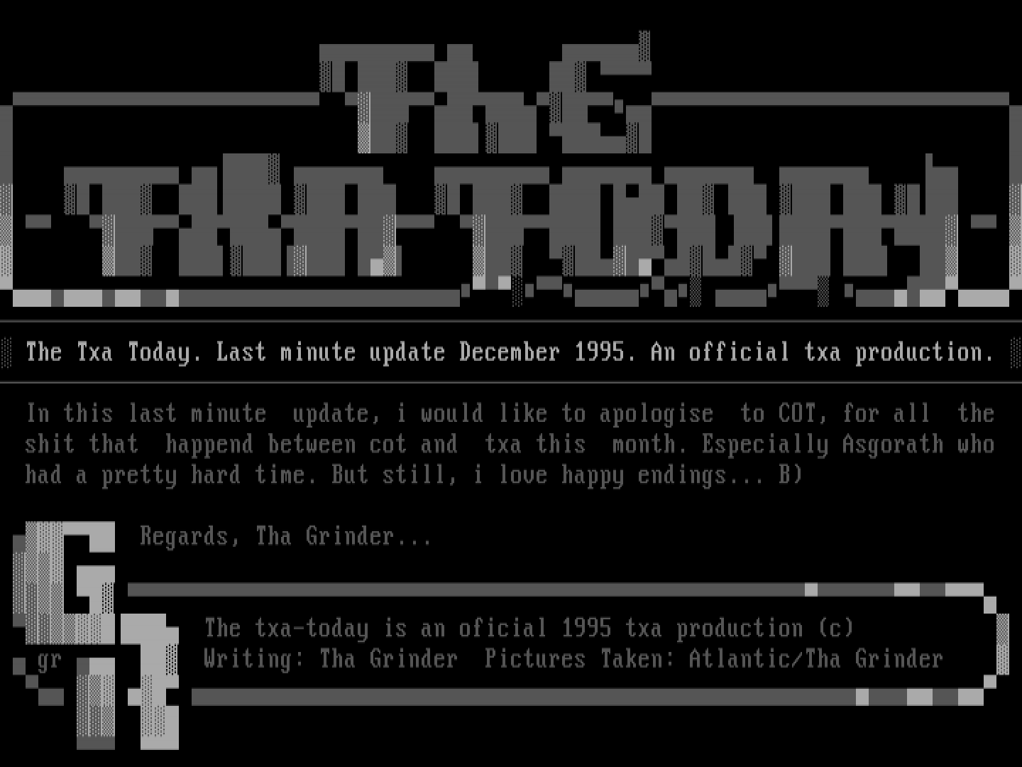 The Txa Today. Last minute update December 1995. An official txa production. In this last minute update, i would like to apologise to COT, for all the