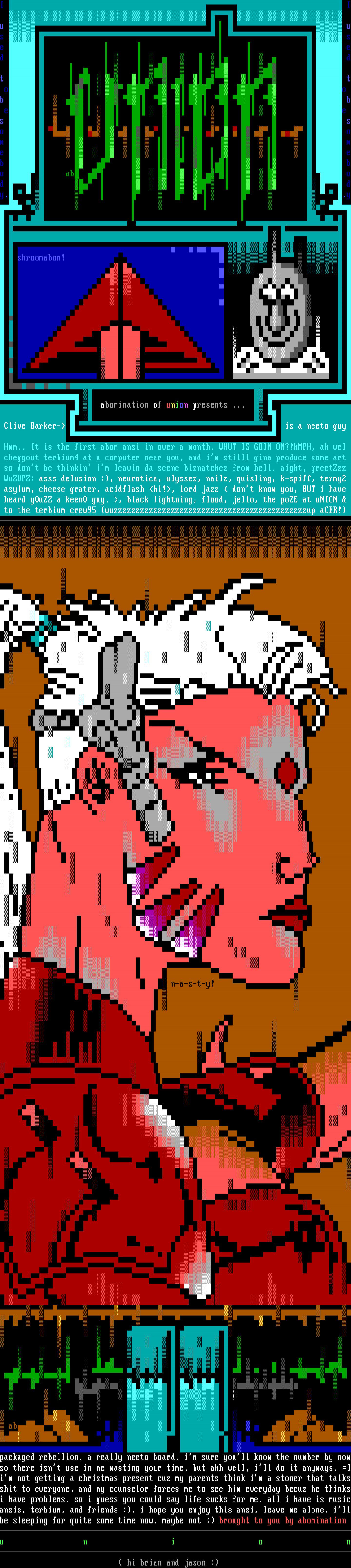 so i guess you could say life sucks for me. all i have is musicansis, terbium, and friends :. i hope you enjoy this ansi, leave me alone. illbe sleeping for quite some time now. maybe not : brought to you by abomination