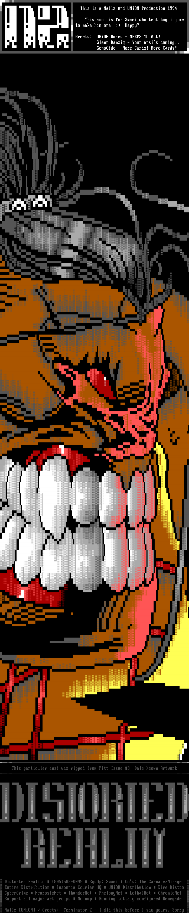 This is a Nailz And UNiON Production 1994 This ansi is for Swami who kept bugging me to make him one. : Happy? Greets: UNiON Dudes - MEEPS TO ALL! Glenn Danzig - Your ansis coming..